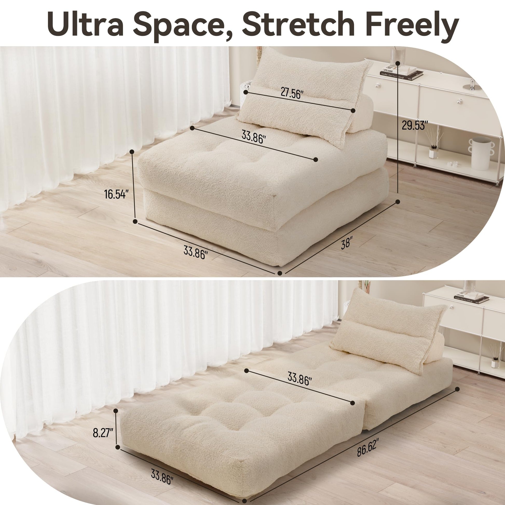 MONVANE Folding Sofa Bed - Ergonomic Foldable Sleeper Chair for Living Room/Dorm/Office, Teddy Velvet Futon Couch, Lounge Sofa, Convertible Floor Mattress, Lazy Sofas with Headrest Lumbar Pillow,Beige