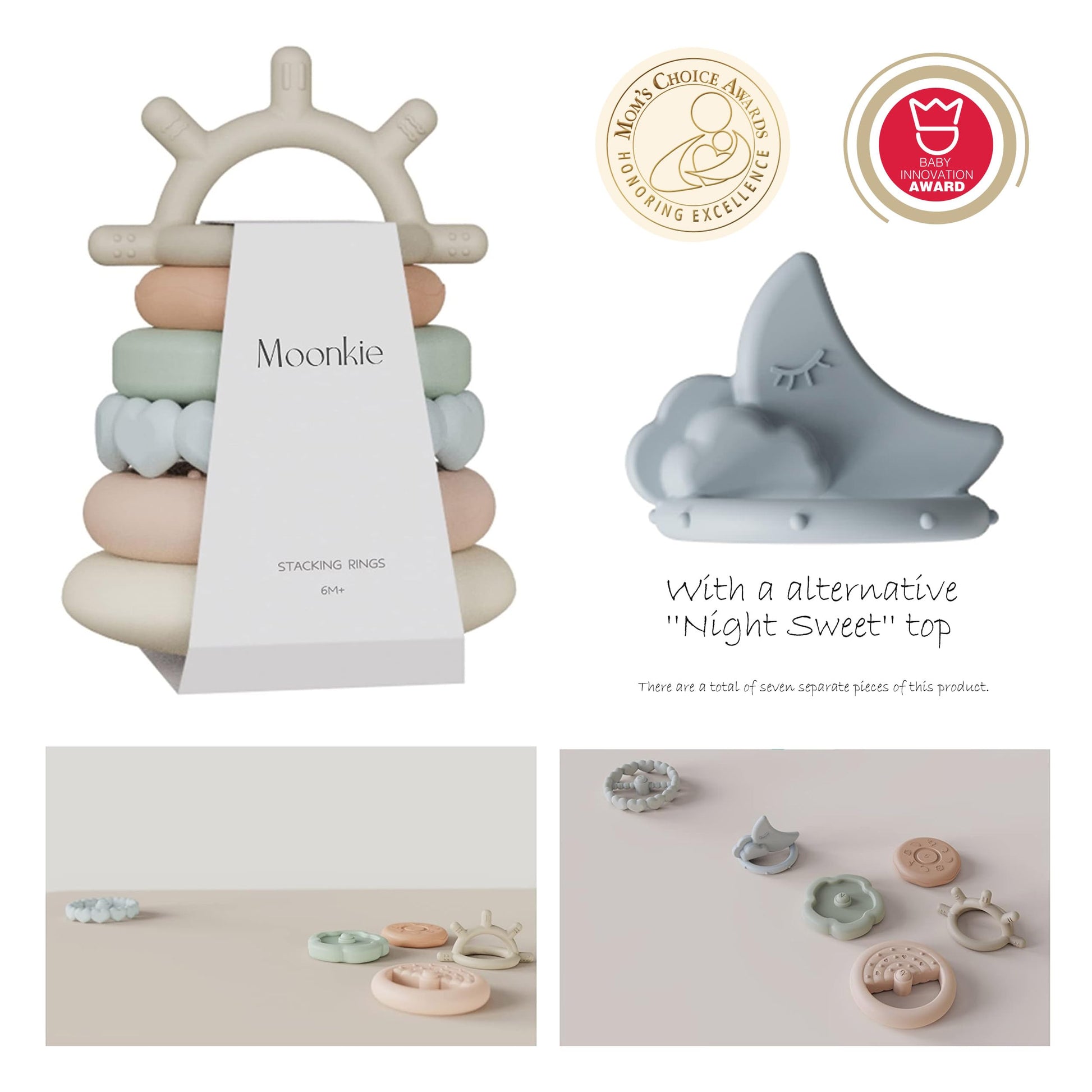 - ✨ PREMIUM QUALITY: Moonkie's 7-piece stacking ring toys are made of high-quality food-grade silicone, without any fillers or off-odors. These soft baby toys are BPA and Phthalate-free, making them safe for your child to play with and bite freely.