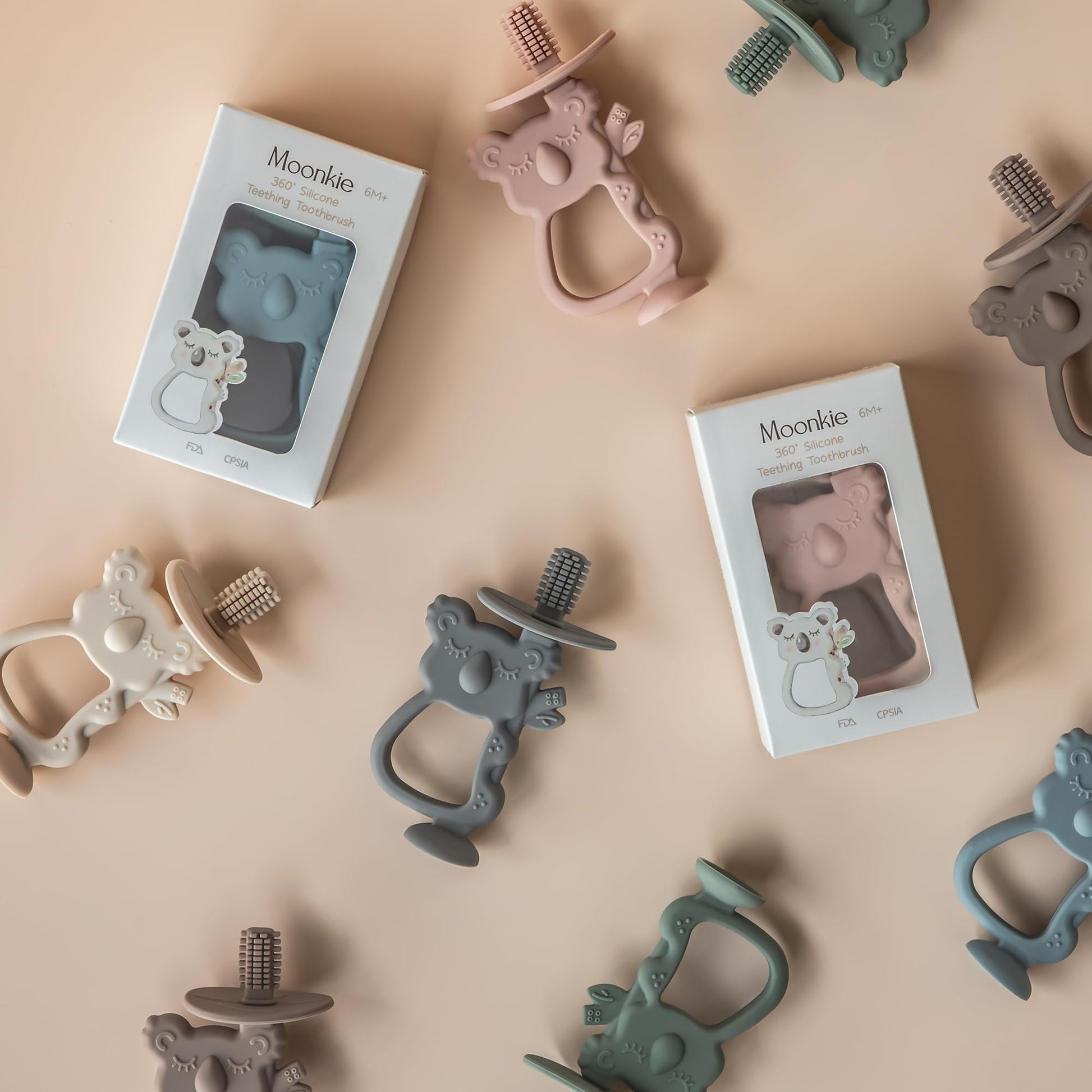 Moonkie Teething Toy, Safe & Easy to Hold BPA Free Silicone Teethers, 360° Baby Toothbrush with Suction Base, Teether Toys Best for Babies 6-12 Months (Koala Warm Taupe)
