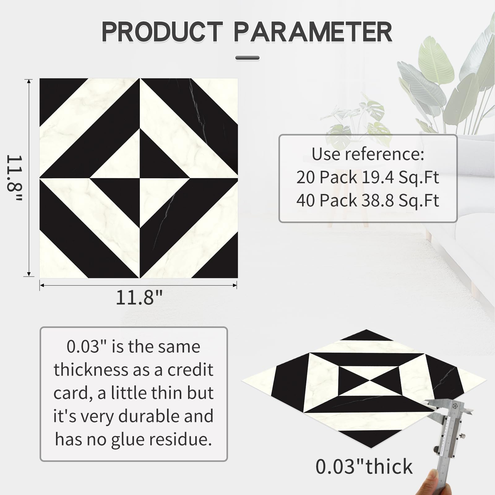 - Packaging Details: Measuring 11.8 x 11.8 inches (30 x 30 cm) with a sleek 0.8mm thickness, each pack contains 20 vinyl flooring that can cover 19.4 square feet