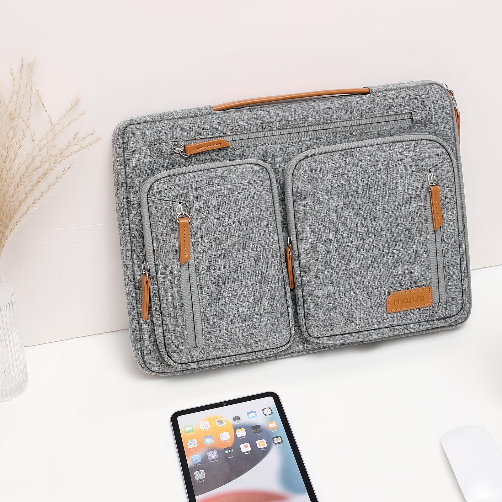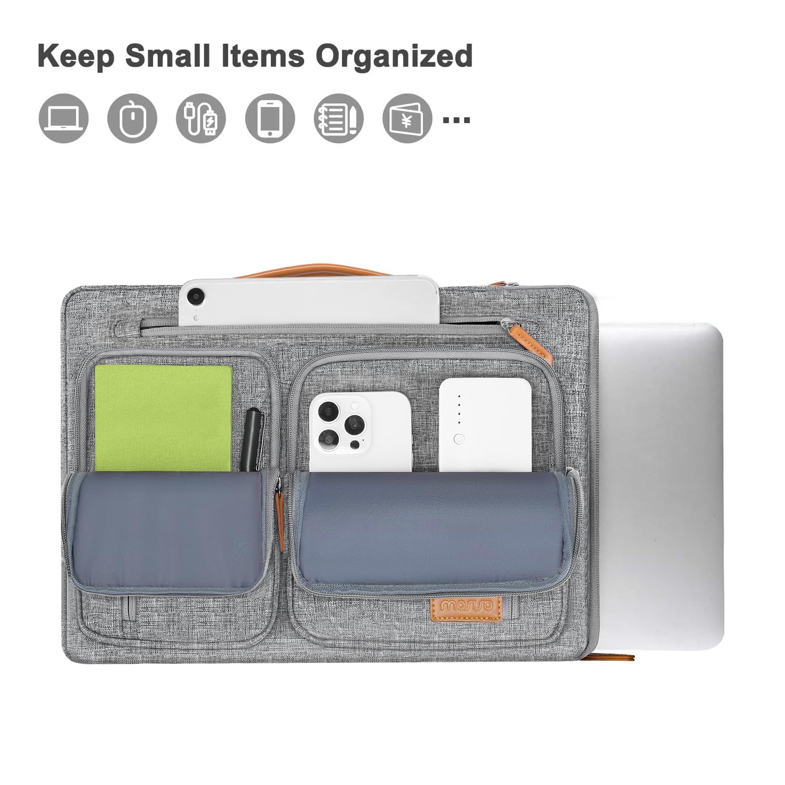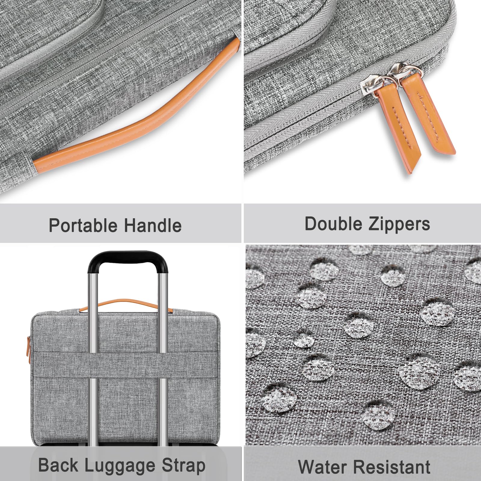 - 360 degree all around protective reinforced interior edge briefcase carrying case bag protect your laptop from any accidental dropping. Extendable handle design makes it to carry your laptop around in comfort, you can also tuck away the handle. Side opening zipper design, avoid accidental dropping of your laptop while carrying. 5 front accessory zipper pockets provide enough space to keep mouse, earphone, pens and notepads, offering added convenience.