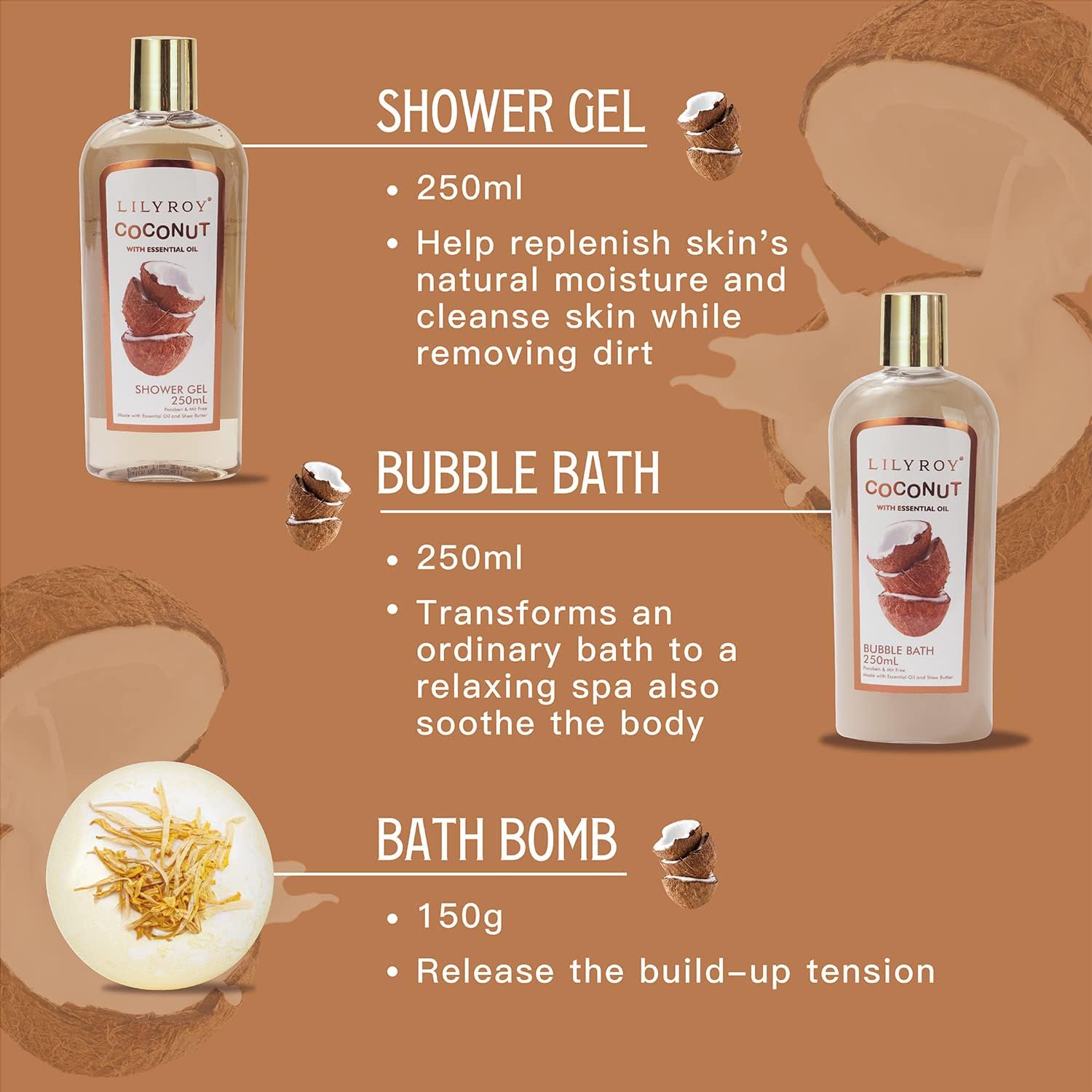 - BATH SETS FOR WOMEN GIFT: Exotic & delicate refreshing seductive Coconut scents make you feel blissful like a holiday. The scent smells fresh