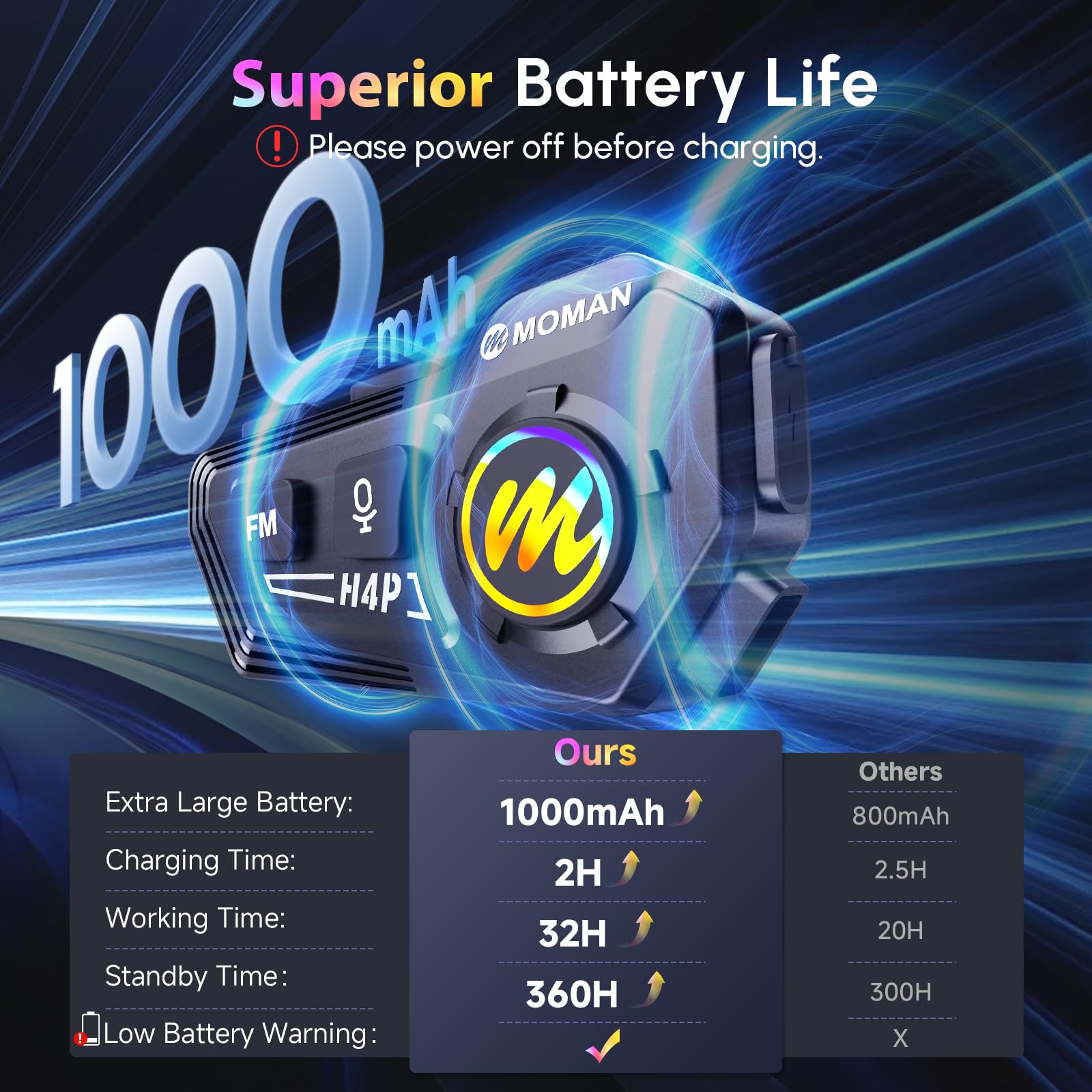 - 【Endless Power & IPX6 Waterproof】Moman RS-H4P is your ultimate riding companion with a robust 1000mAh battery, offering up to 32 hours of nonstop use—no more worrying about running out of power on long rides. Built for any weather, it boasts an IPX6 waterproof rating and dust & sand resistance, ensuring peak performance, from torrential rain to desert dust. Ride with confidence, knowing your headset can handle whatever the elements throw at you.
