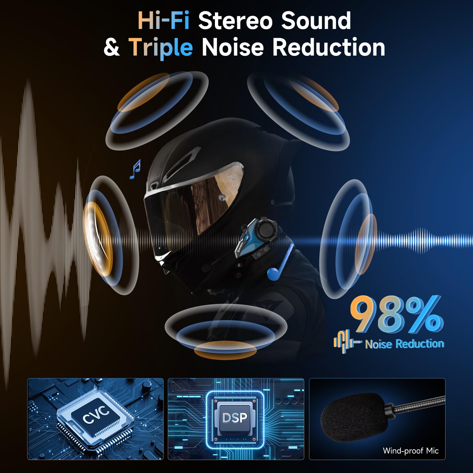 - 【Immersive Hi-Fi Stereo & Triple Noise Cancellation】Experience premium sound quality with motorcycle helmet headset H2E's Hi-Fi 40mm speakers, delivering deep bass, crisp highs, and a lifelike stereo effect for an immersive ride. Built-in DSP + CVC + windproof mic technology reduces ambient noise by 98%, ensuring clear voice communication even at high speeds. Say goodbye to wind noise and hello to a distraction-free ride!