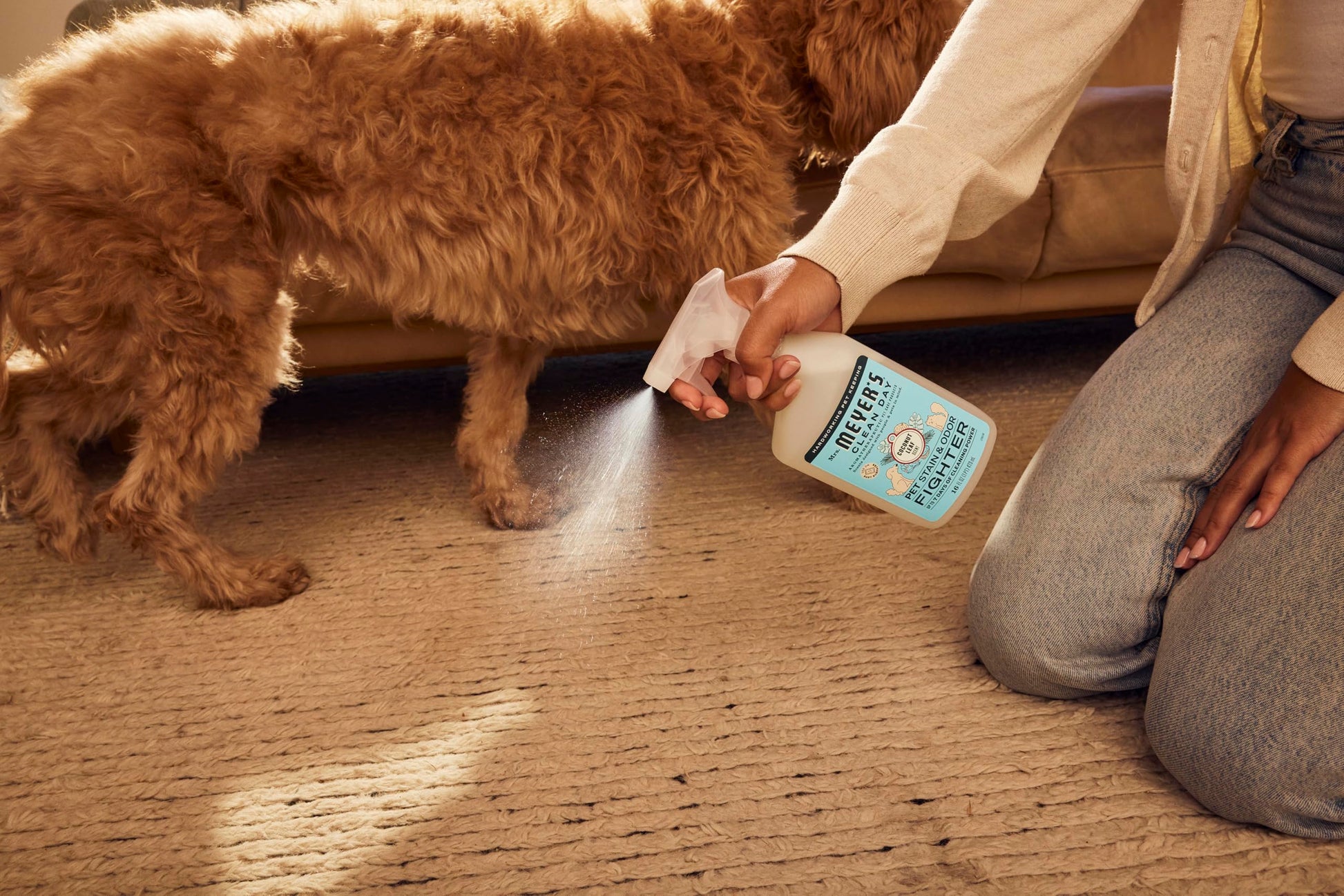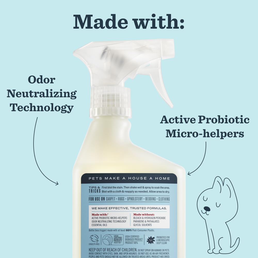 Details: Mrs. Meyer’s Clean Day for your pets. Our new Stain & Odor Fighter is tough on pet messes and accidents but friendly on whiskers and paws. With scents designed with people and pets in mind, this hardworking product fights pet stains and odors for up to 7 days with the power of probiotics for all your soft surfaces—from carpets, rugs and couches to bedding, upholstery, and clothing. Because everybody (especially our pets!) oops sometimes.