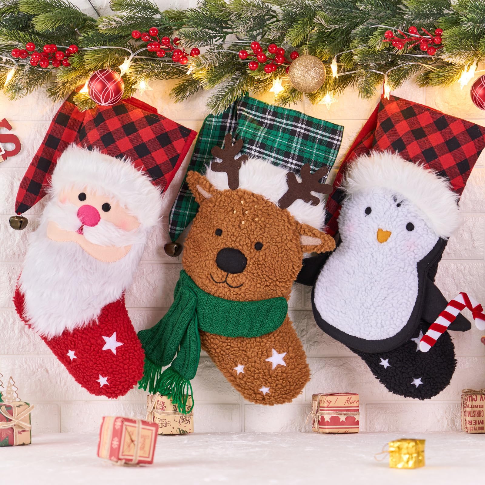 Munidow 3 Pack 18" Large Christmas Stocking, 3D Plush Christmas Stocking Santa Penguin Fur Xmas Stocking Holiday Christmas Decoration Gifts for Family Holiday Christmas Party Decorations D1