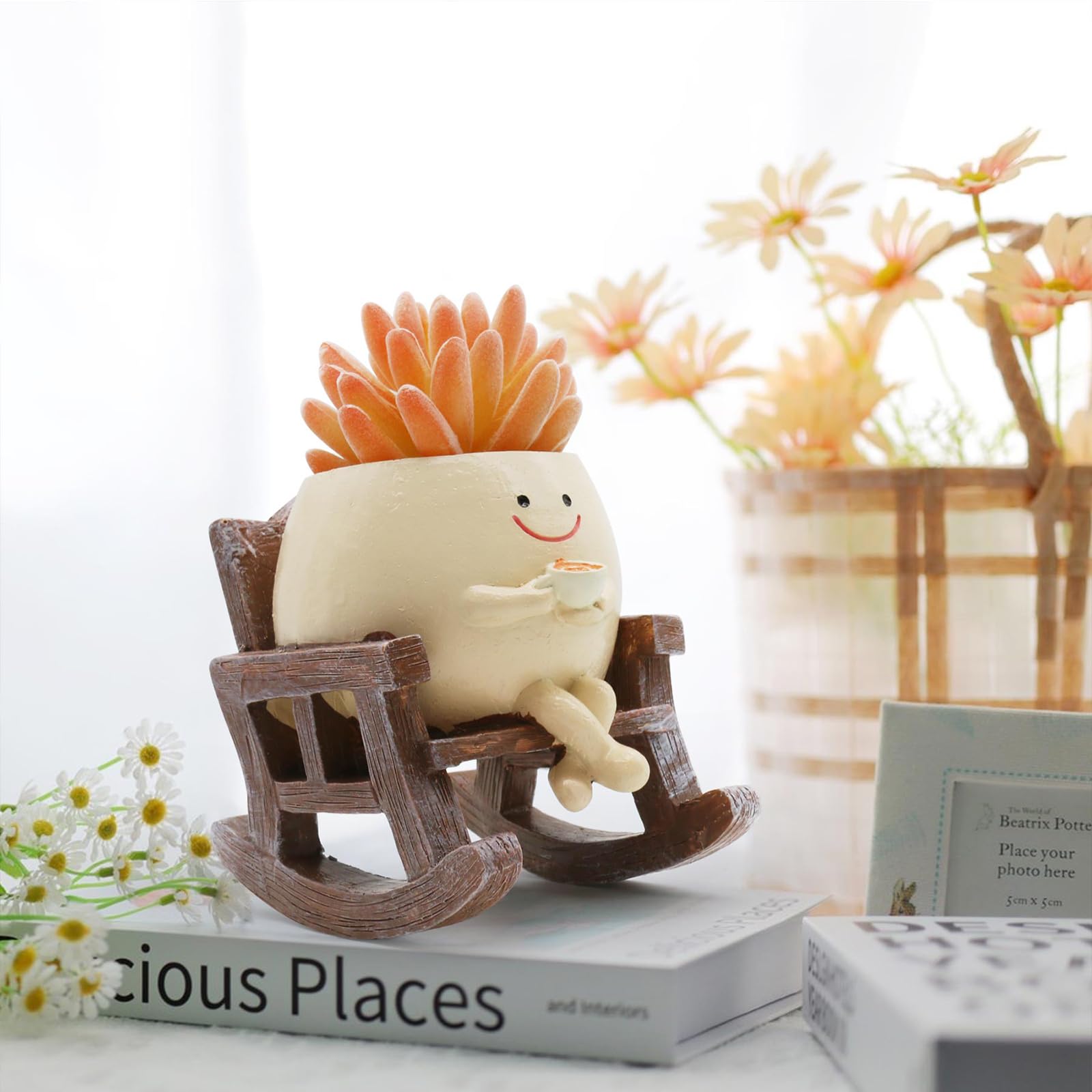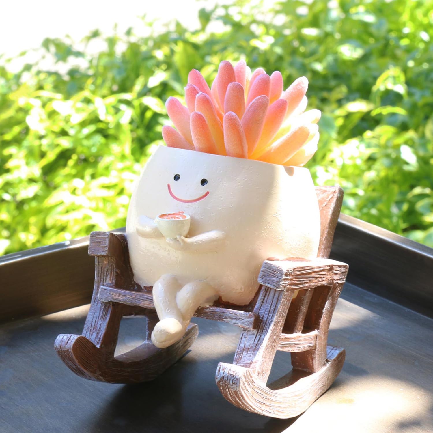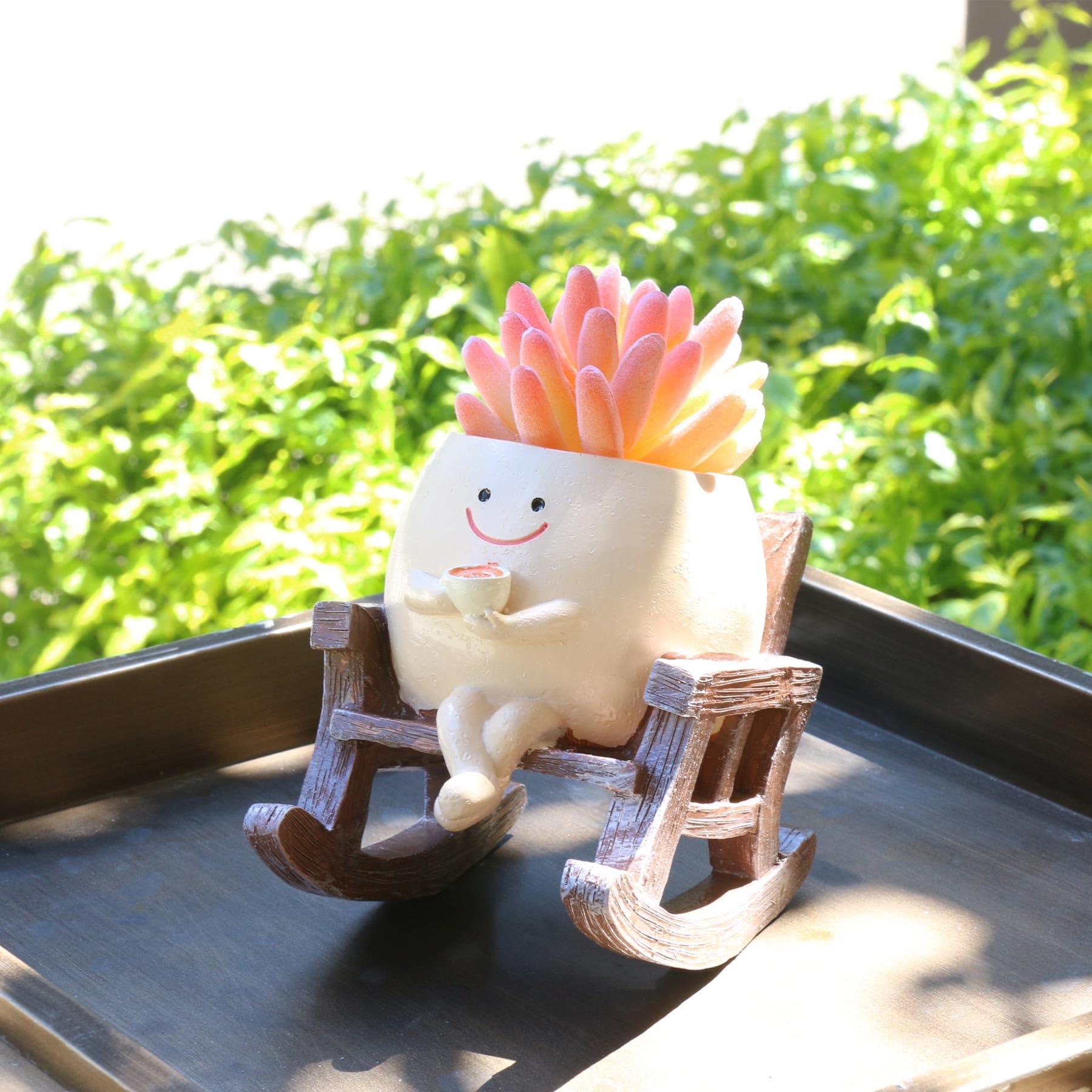 - Design & Material: The small, cute, and decorative plant pot perfect for both indoor and outdoor spaces. Made of high-quality resin material, this planter features a charming smiling face drinking coffe in rocking chair design that adds a touch of fun to your plant collection.