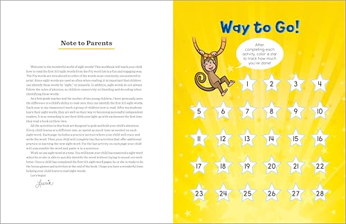 My Sight Words Workbook is: COLORFUL AND ILLUSTRATED: Pictures, examples, and a little monkey helper make this book friendly and encouraging. READY TO READ: This book is ready to use exactly as it is, and the pages can easily be reproduced for a whole classroom. MOTIVATIONAL: Kids can color in a star for every word they master and see their progress in real time to stay motivated and engaged while they learn.
