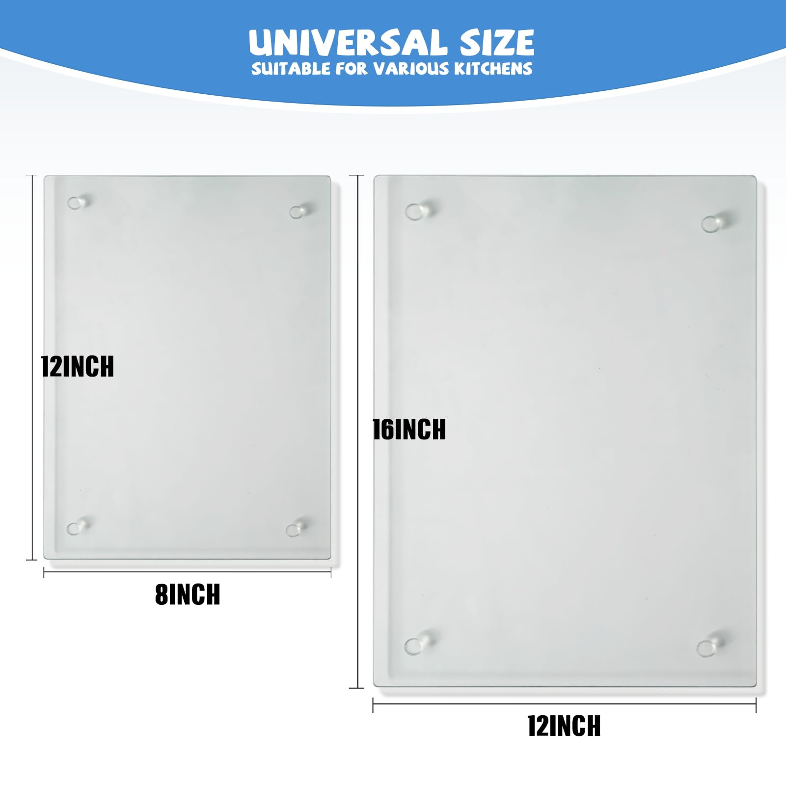 - PRODUCT FEATURES: Glass cutting board is made of tempered glass for long-lasting durability. The four edges of the product are carefully polished and very smooth and safe, 12x16' & 12x8' ,Set of 2 (Clear).