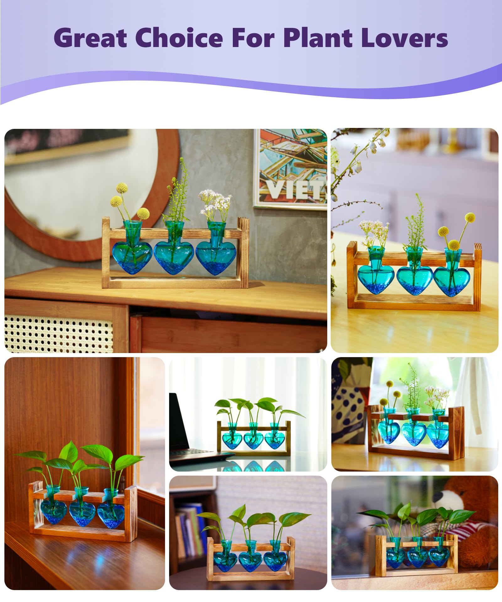 Nacome Plant Terrarium for Office Decor: Birthday Gifts for Plant Lovers Women Mom Wife - Wooden Stand Tabletop Planter 3 Bulb Glass Vase Heart Shaped for Hydroponics Indoor Home