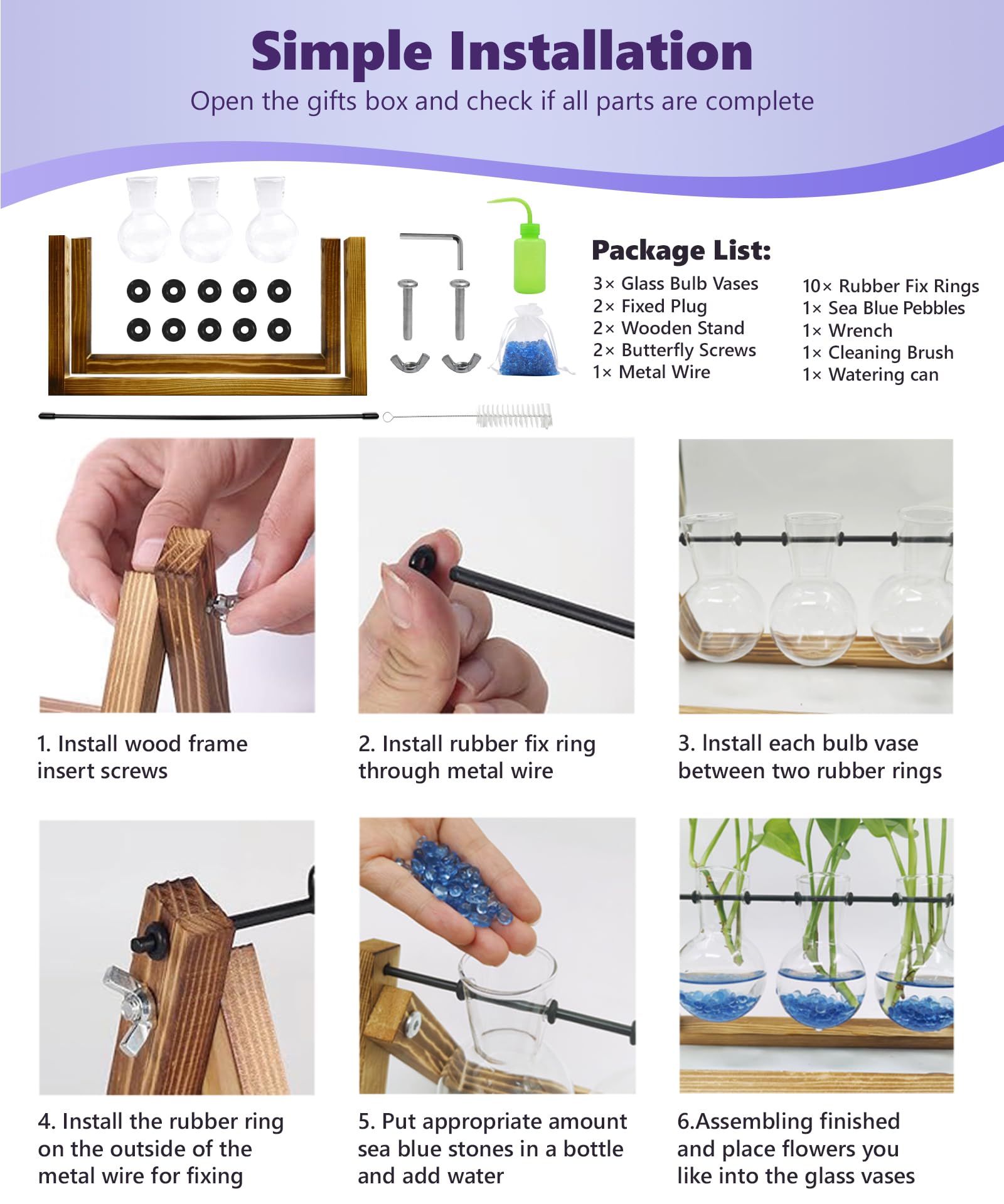 - Unique Design:Convenient installation, can be set up in few minutes. Perfect combination of natural wood and clear glass- Frame is made of sturdy and robust nature wood, 3 bulb terrariums are made of High boron silicon heat resistant glass