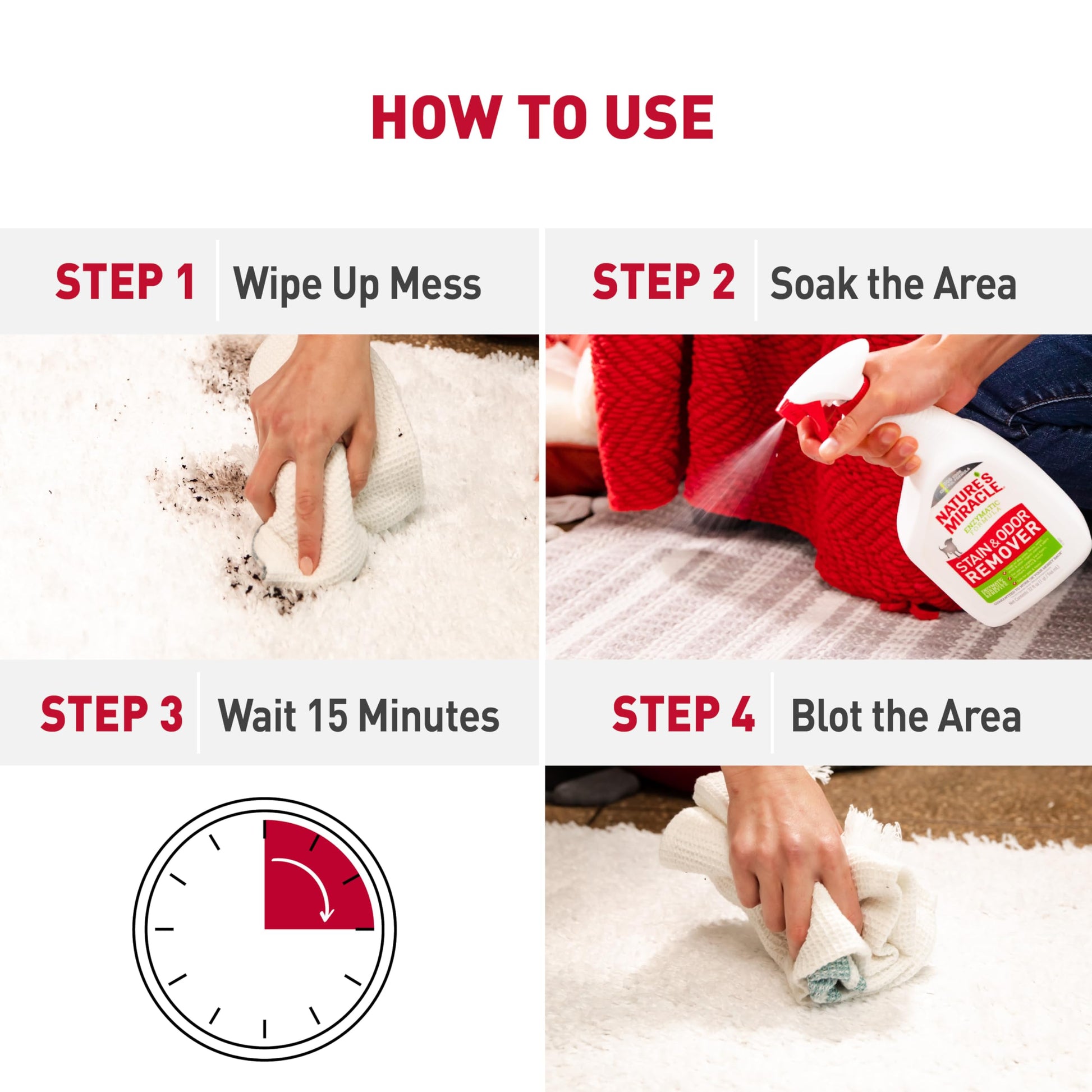 - SPOT STAIN & ODOR REMOVER: Begins to break down and remove stains immediately on contact.