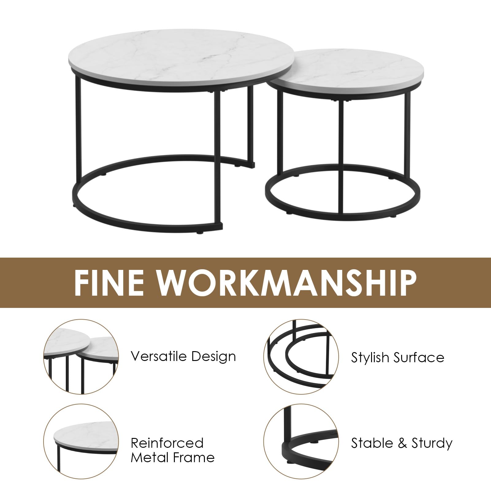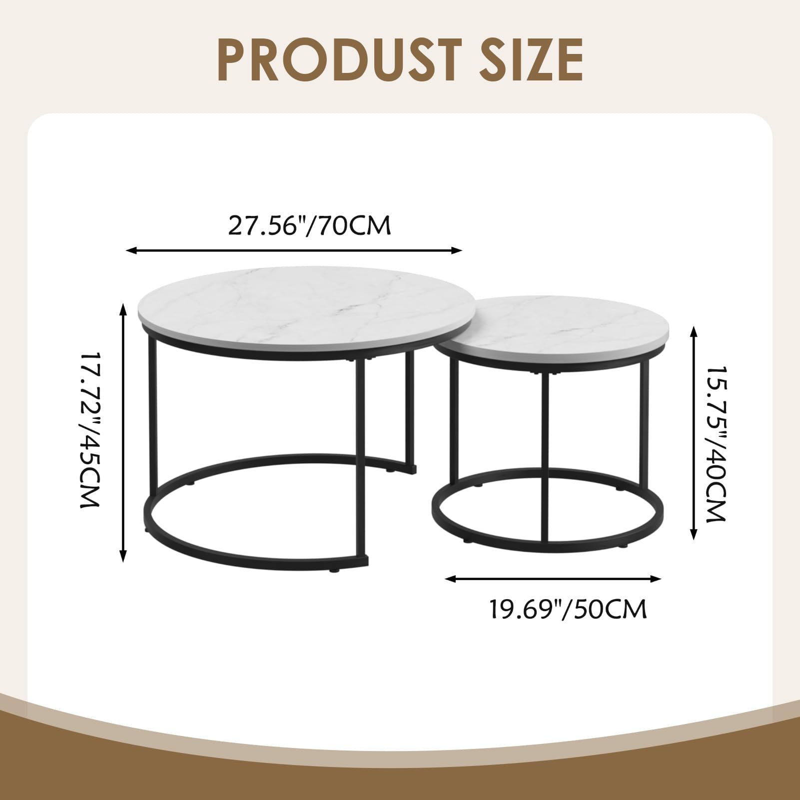 Nesting Coffee Table Set of 2 Marble Pattern with Sturdy Metal Frame Round Side Tables for Living Room and Bedroom (White)