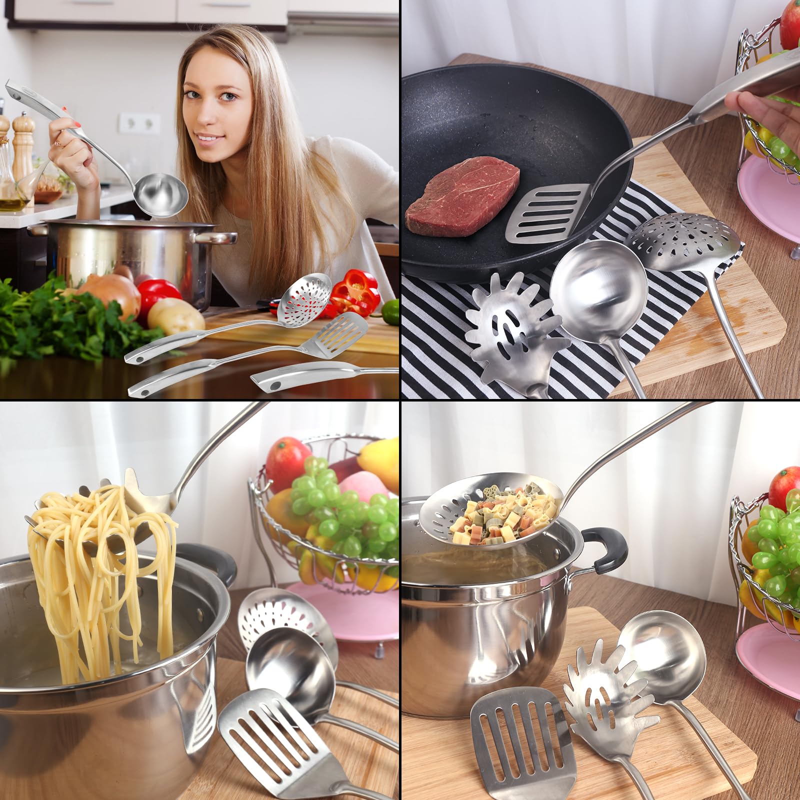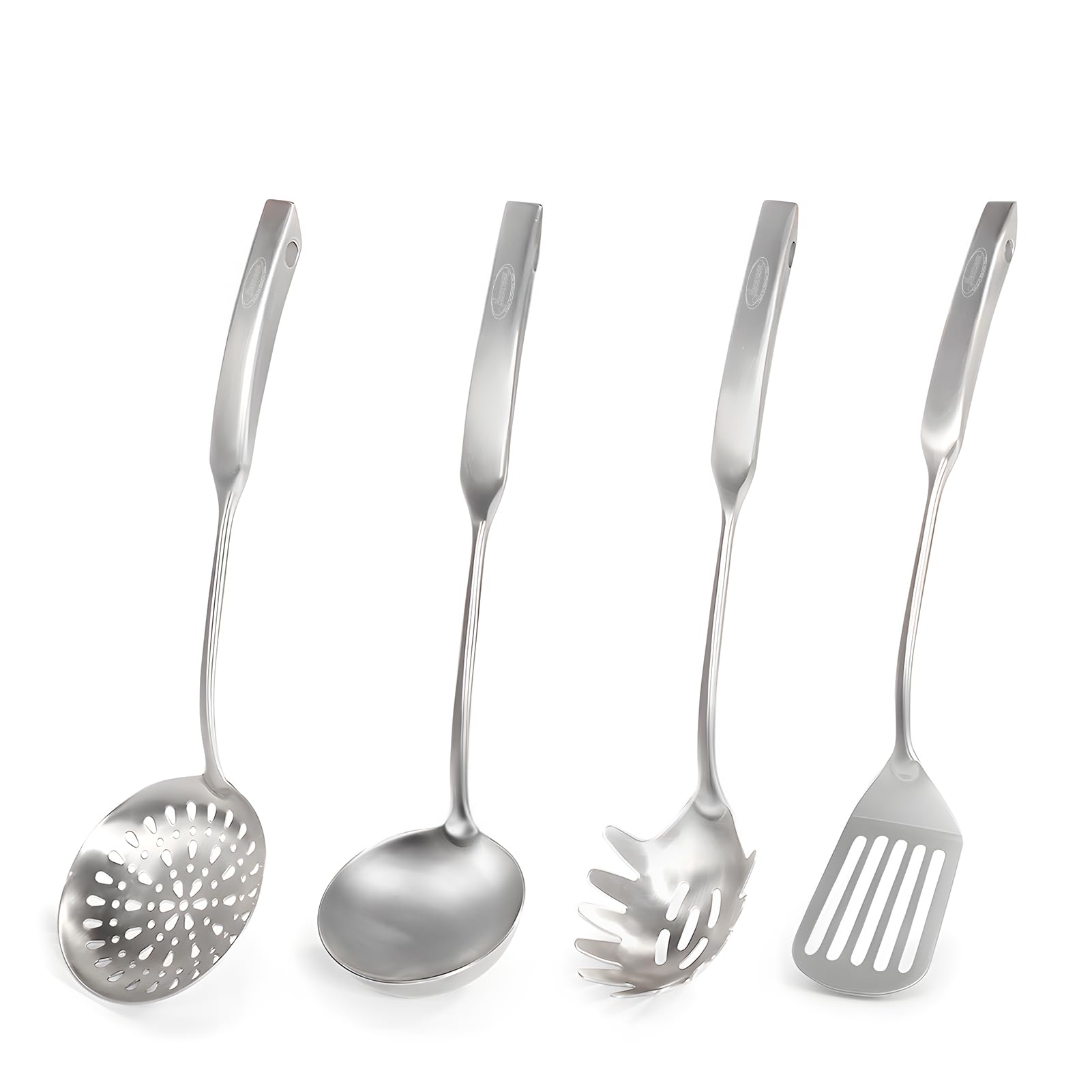 - Package Includes (4pcs): 1 Skimmer Slotted Spoon, 1 Slotted Spatula Turner, 1 Spaghetti Server and 1 Soup Ladle. Meet your needs for different cuisines, such as fries, eggs, steaks, sauces, pancakes, etc.