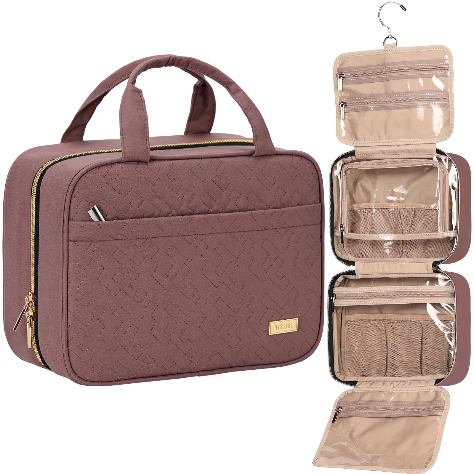 NISHEL Travel Toiletry Bag for women, Portable Hanging Organizer for Full-Sized Shampoo, Conditioner, Brushes Set, Makeup Accessories, Large Size, Black