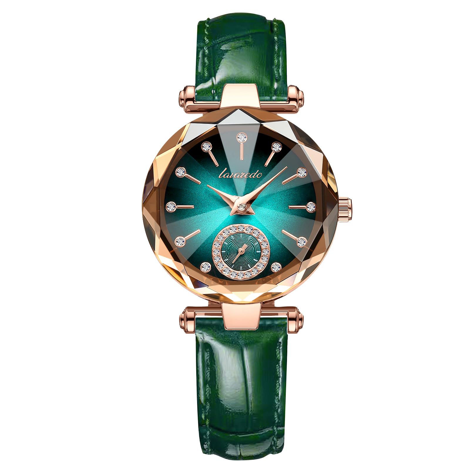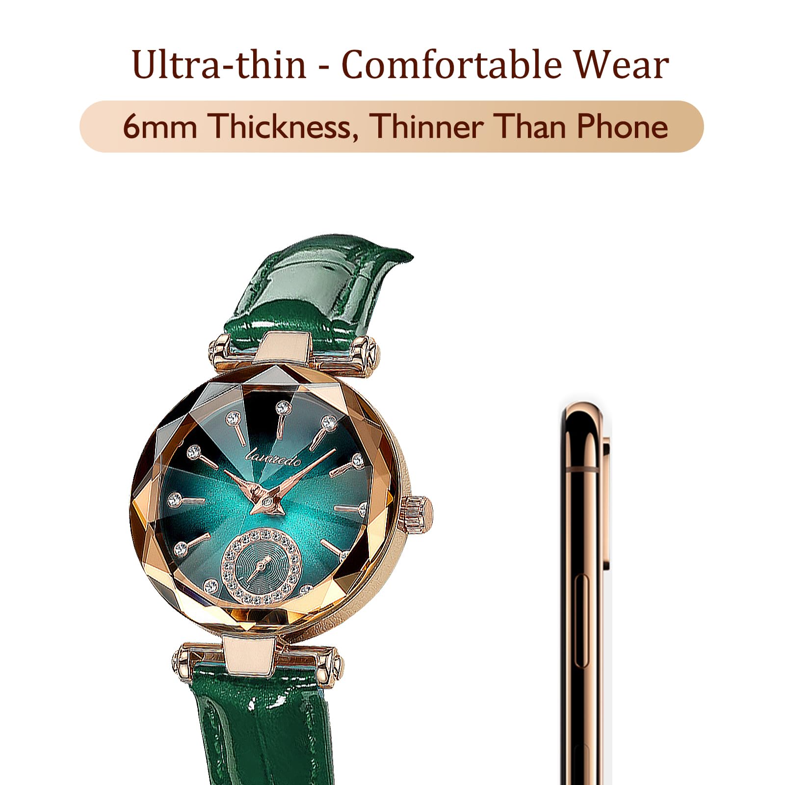 - π Elegant Design: This womens watch features a unique diamond-cut glass and luxury rhinestone-decorated dial, paired with a dainty leather band. Perfect for any occasion, Cocktail Party, Evening Party, Prom, or Wedding.