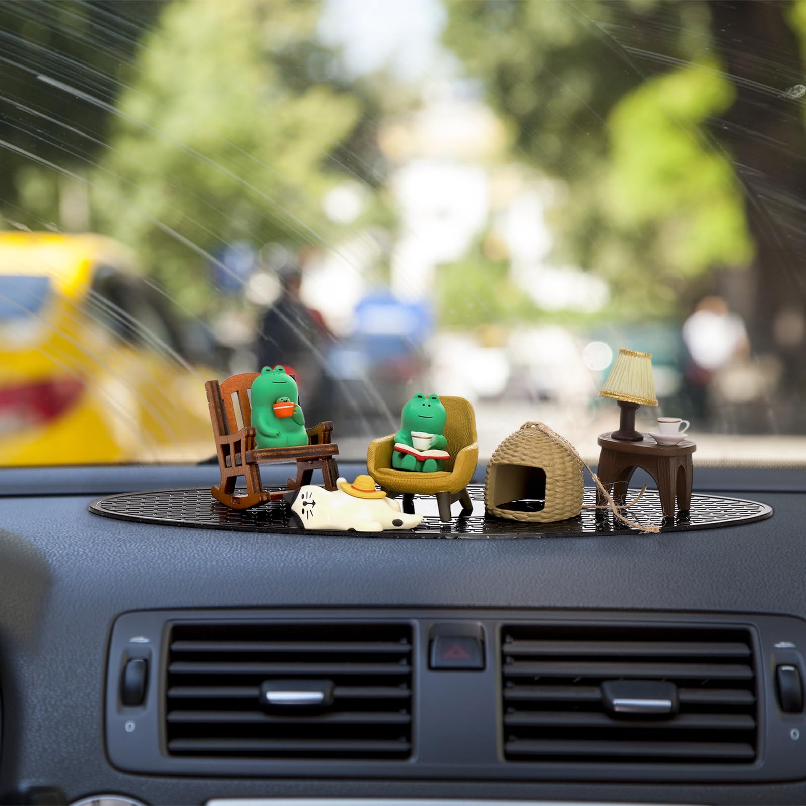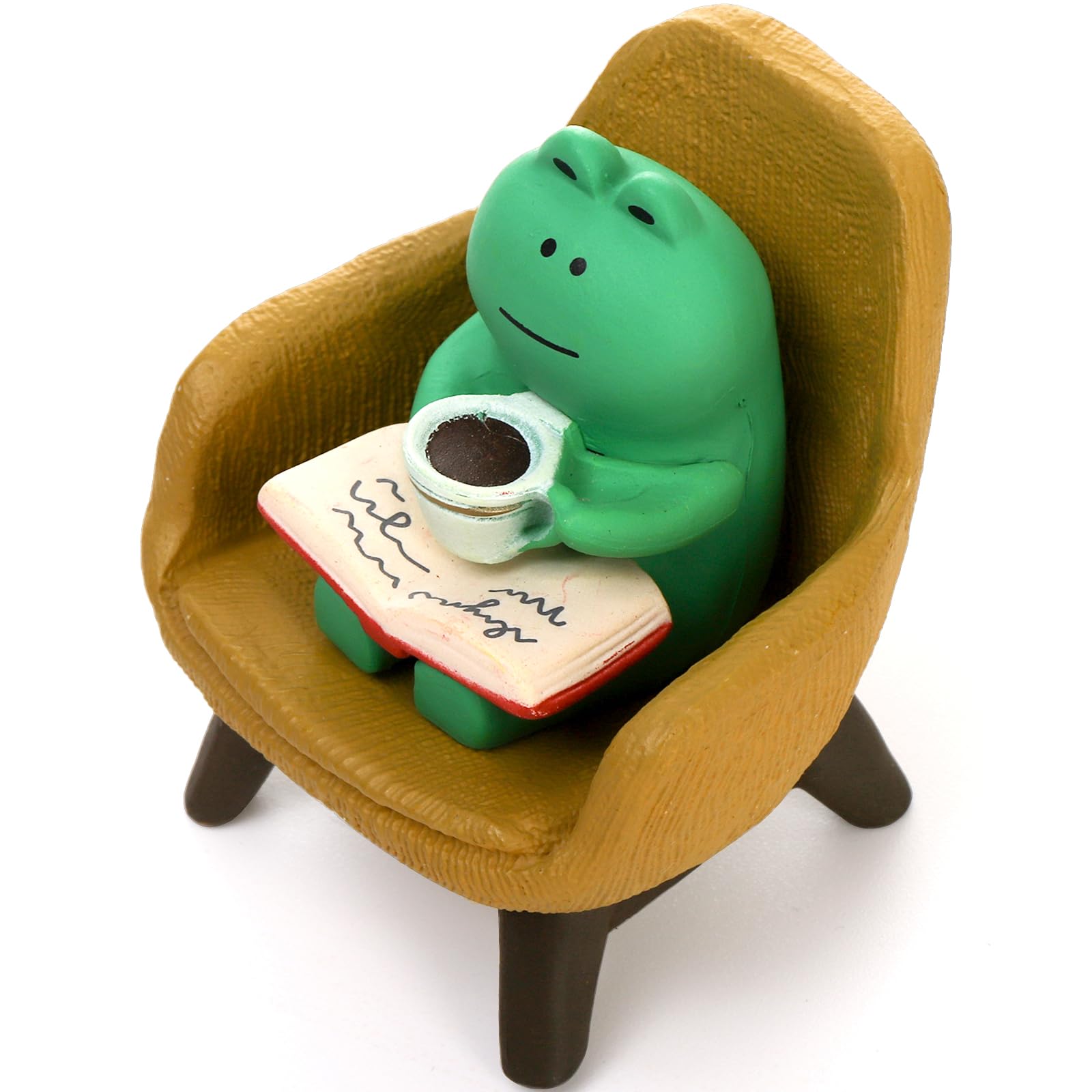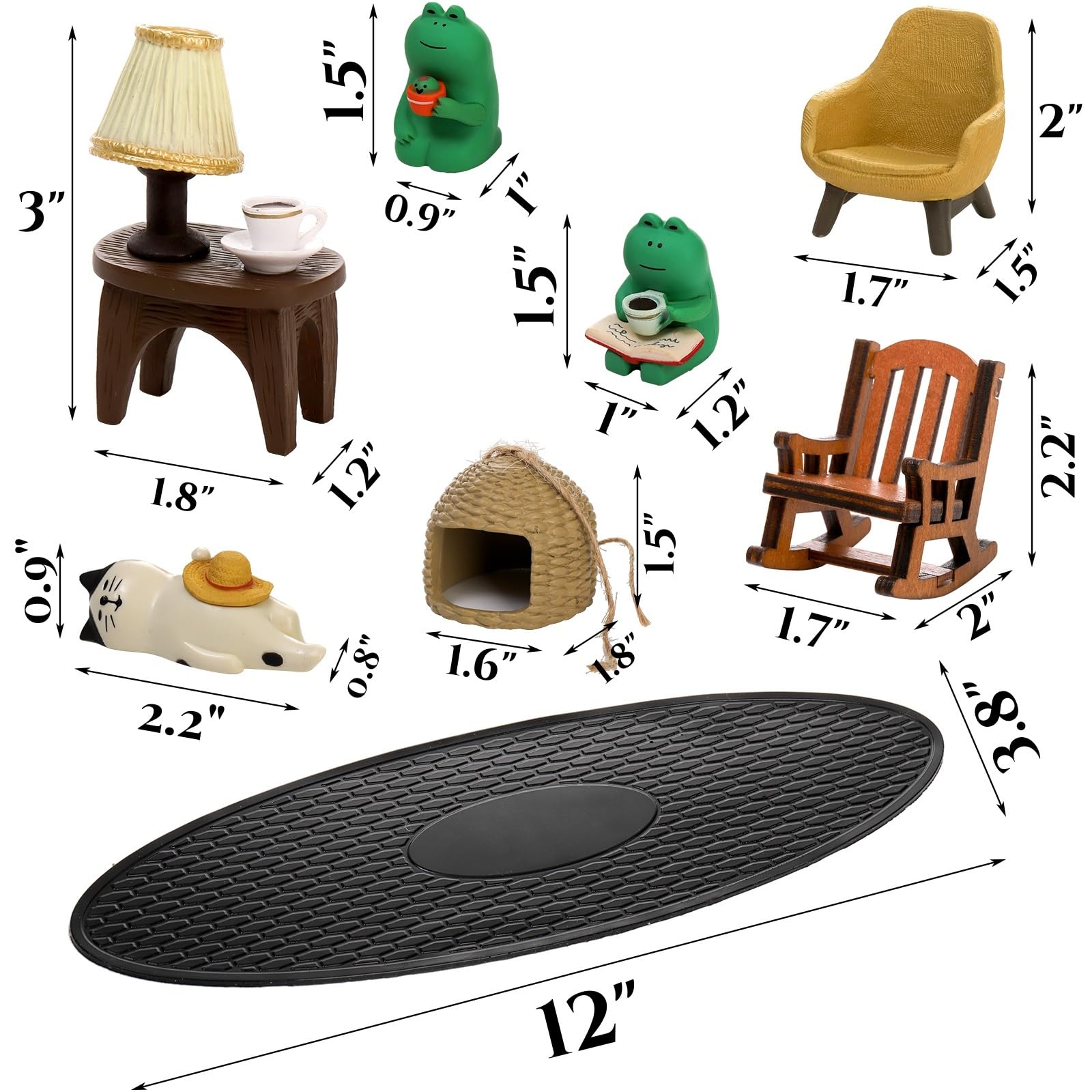 - What You Will Receive: This frog decor set comprises 8 pieces, including a miniature frog figurine engrossed in a book while enjoying a cup of coffee, another frog relishing a glass of wine, a charming little cat, a wooden rocking chair, a yellow sofa stool, a desk lamp table, and an oval black non-slip mat. It offers exceptional value beyond expectations.