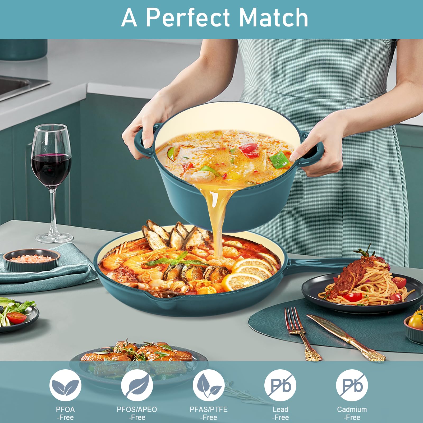 Nonstick Enameled Cast Iron Cookware Set- 9 Pieces Dutch Oven Pot with Lid for Braising, Stews, Roasting, Bread Baking, Cooking Pot Oven Safe & Compatible with All Stovetop, Teal Ombre