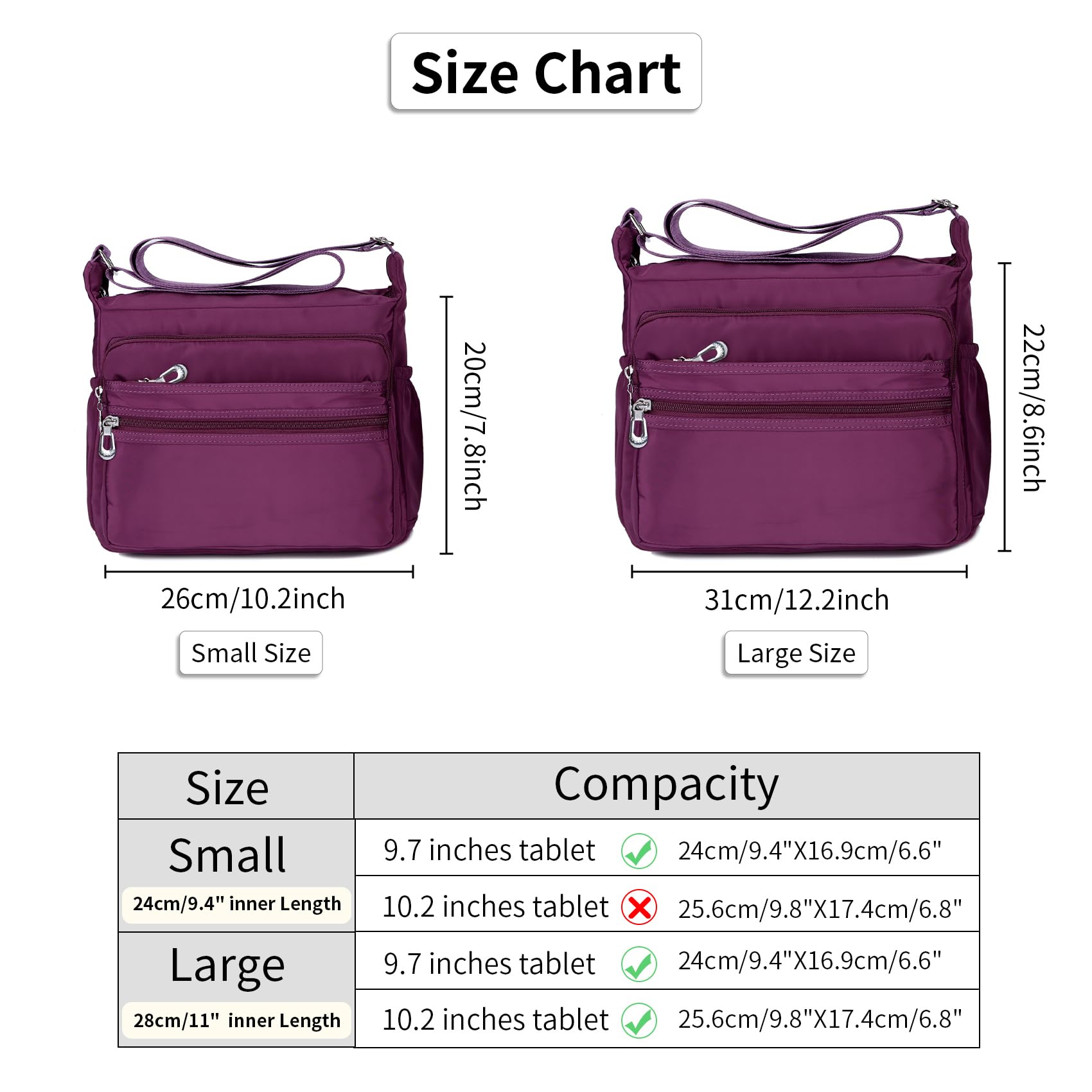 - Size: Large size:12.2 x 4.3 x 8.6 inch ;Small size:10.2 x 3.5 x 7.8 inch (L x W x H),.Lightweight crossbody bags for women travel and everyday use. The New Zipper Feature: The zipper puller may be in the middle of the track while both end is closed. Open the forward end of the zipper with your finger and then you can see a normal functioning zipper. Now zip up all your porckets and get ready for your trip!