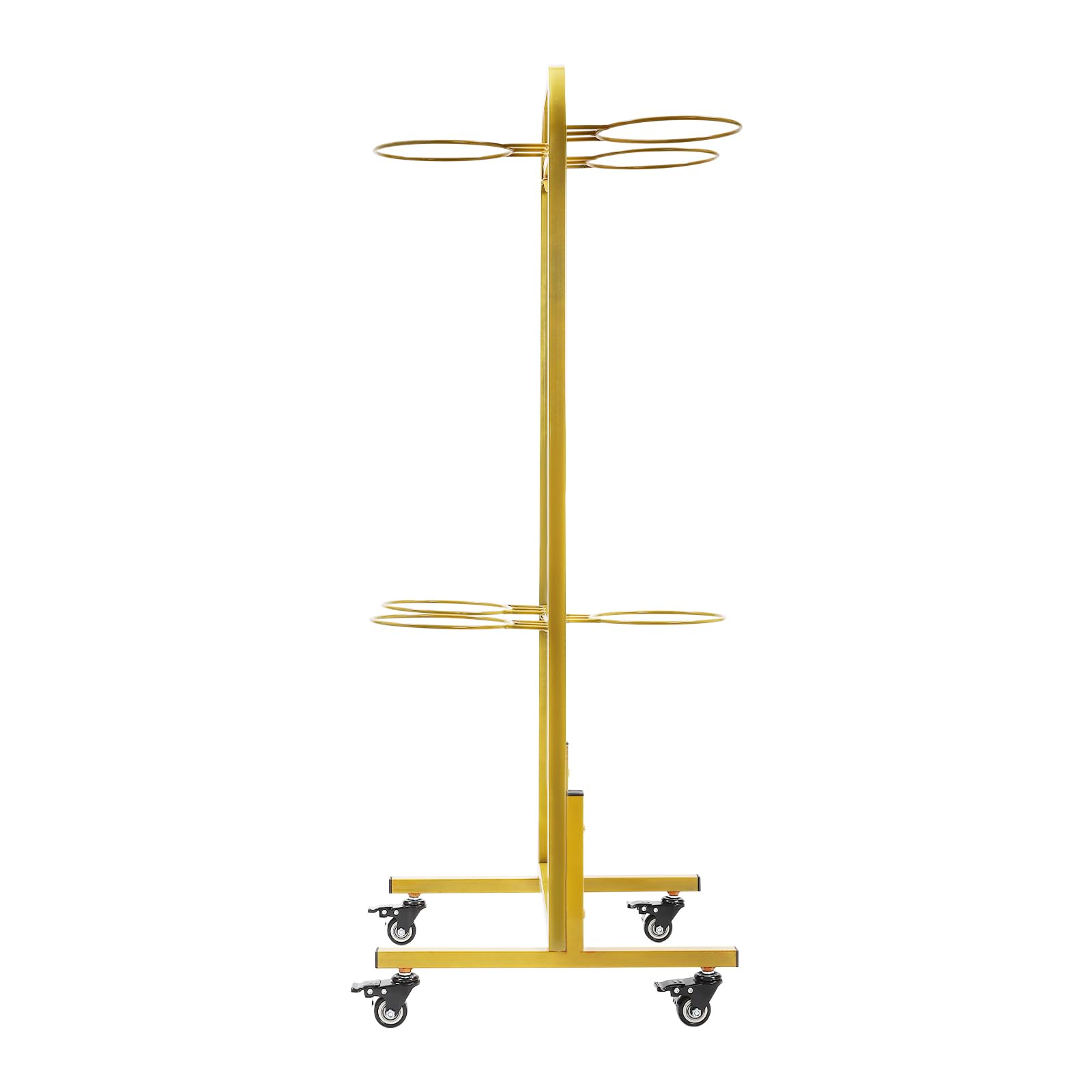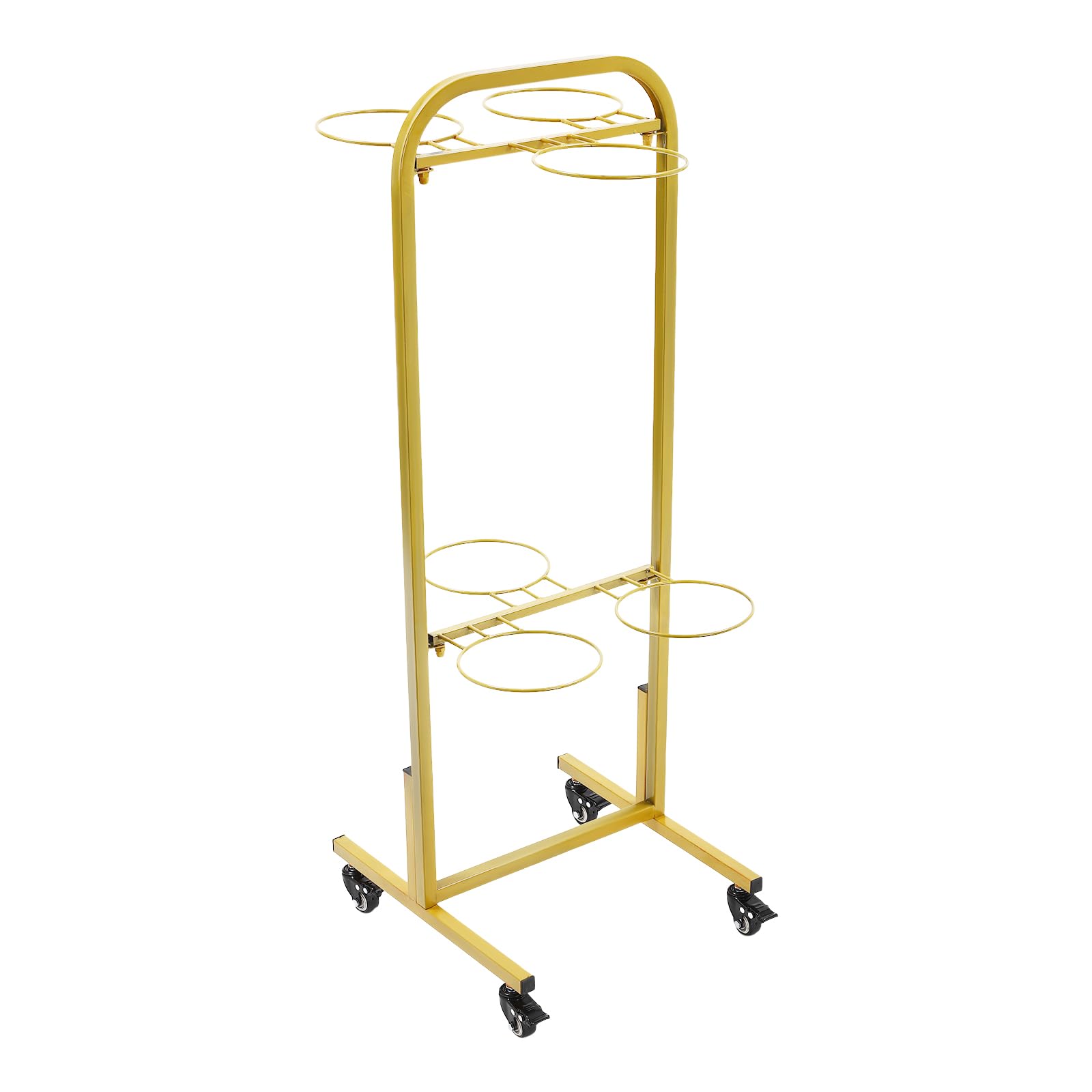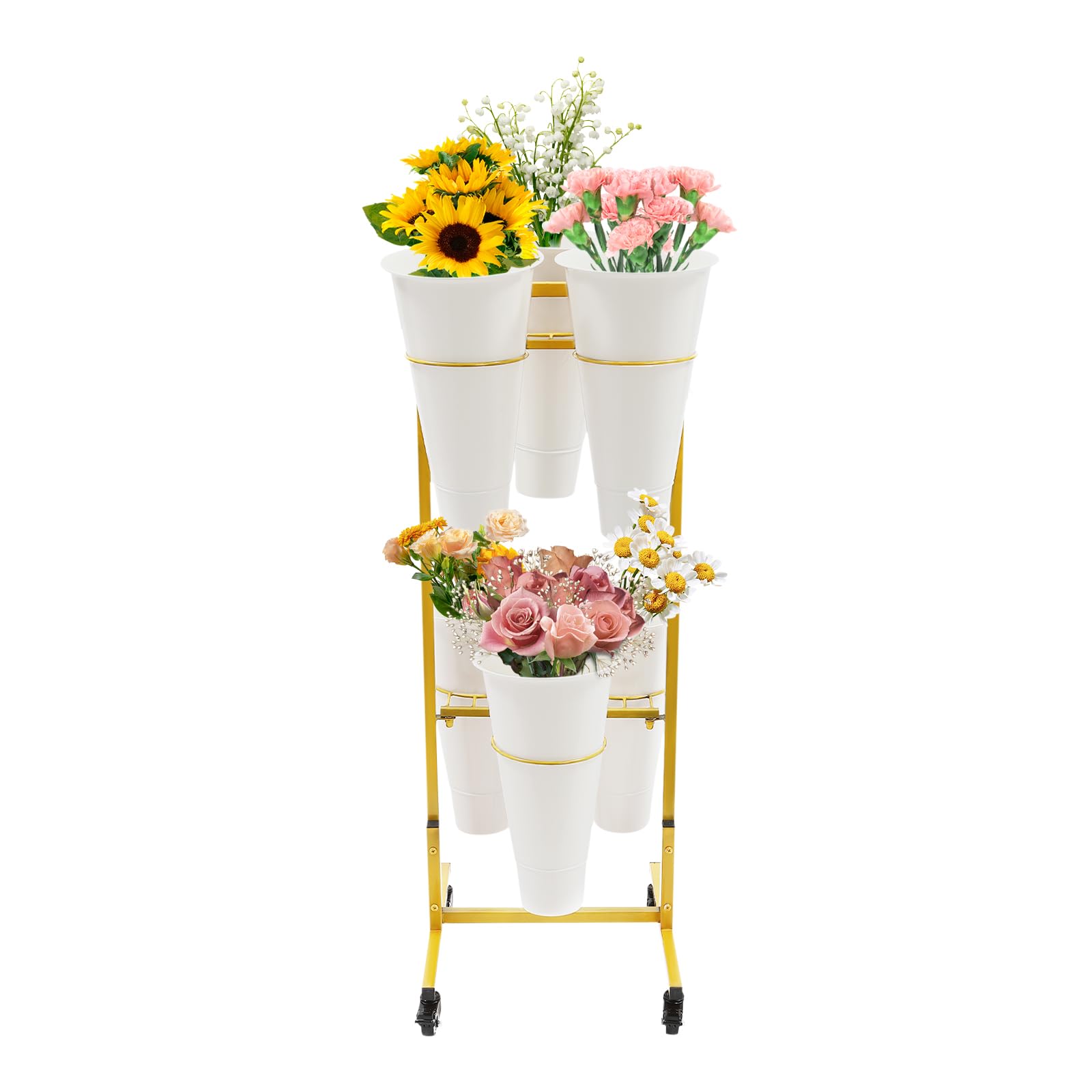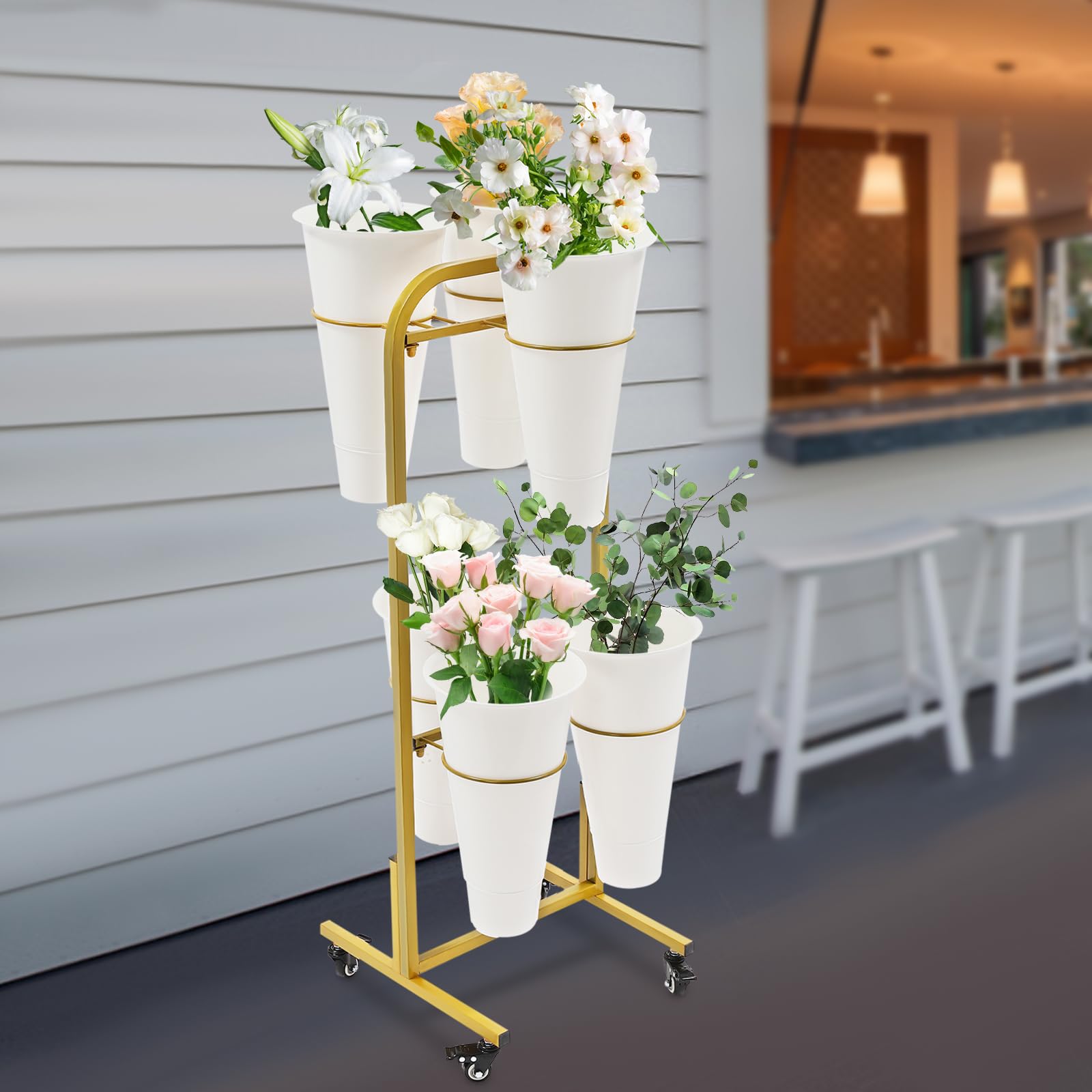 Nozue Flower Display Stand, 2Layers Metal Plant Stand with Wheels, with 6pcs Buckets, Portable Plant Moving Cart Frame for Indoor, Florist, Living Room (Gold - White Round Bucket)