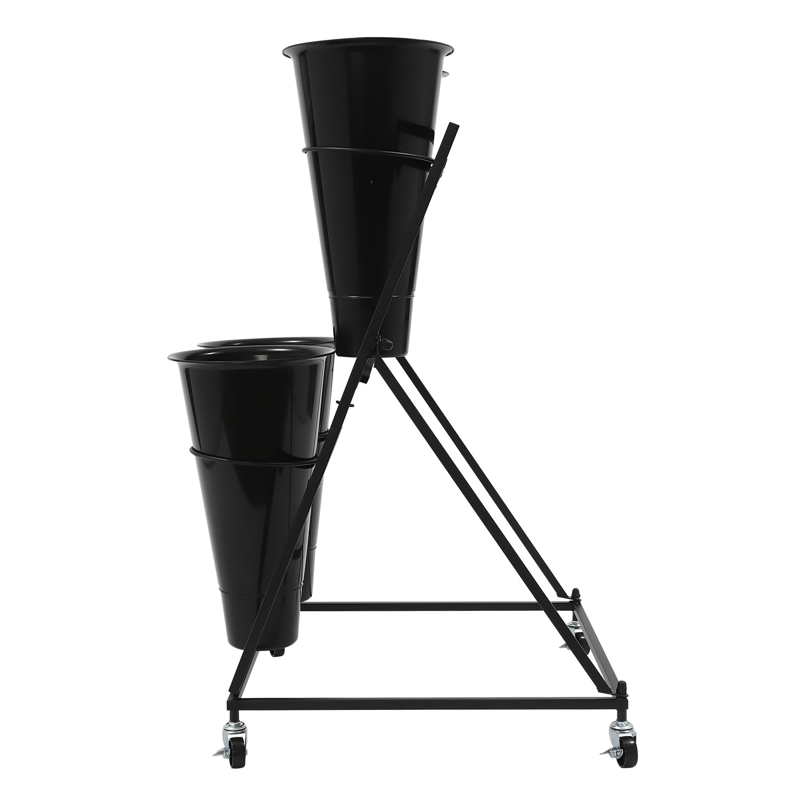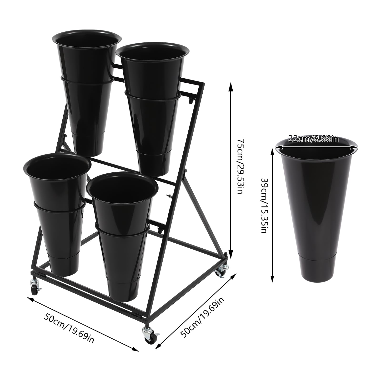 Nozue Flower Display Stand, with 4pcs Buckets, 2 Layers Metal Plant Stand with Wheels, Heavy Duty Detachable Plant Moving Cart Frame for Indoor, Living Room, Florist (Black- Black round bucket)