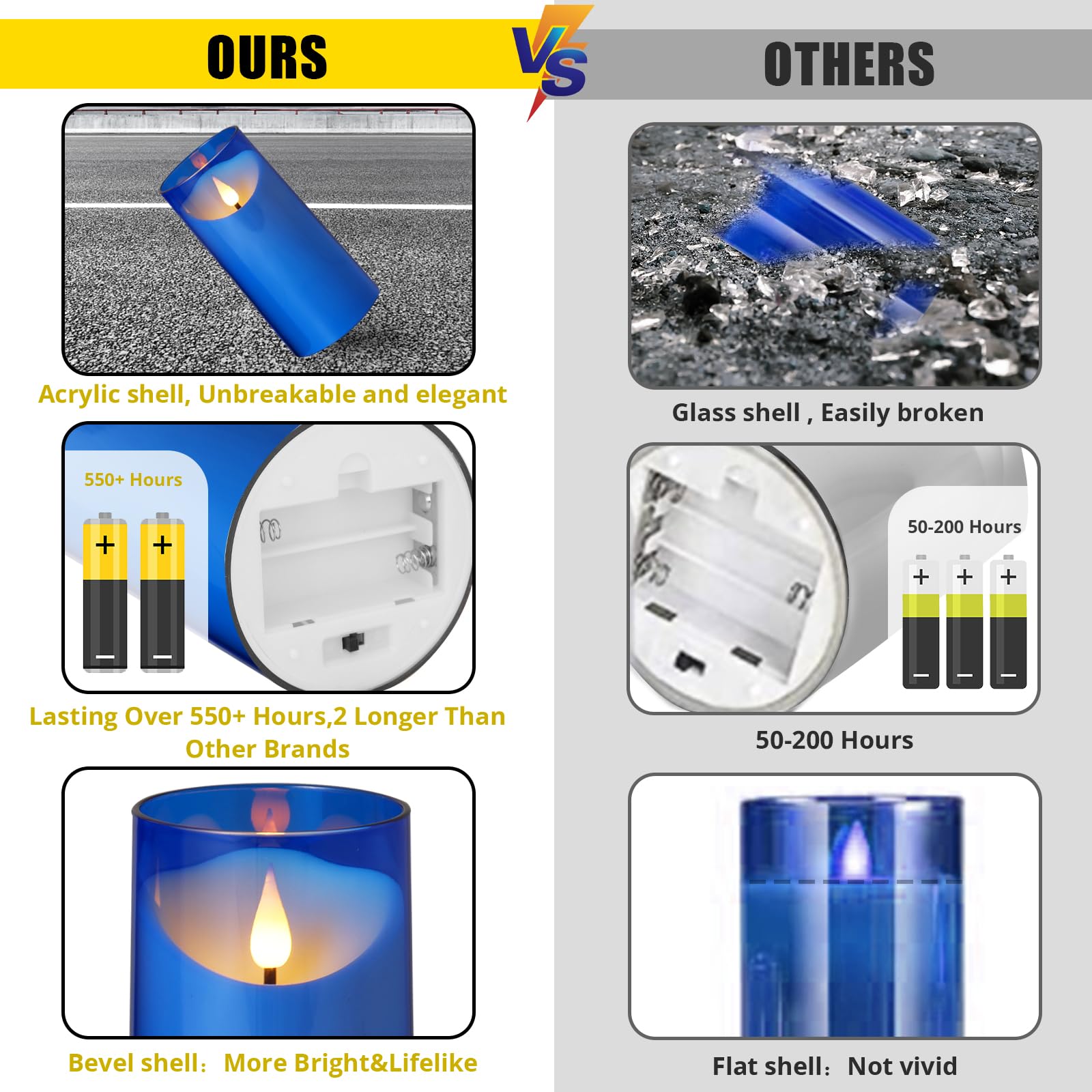 - 【Value Package】3 x battery operated candles(D:3'x H:4'5'6'), 1 x remote control, 1 x user manual. Each flickering candle requires 2 AA batteries (Not Included) which would last 500+hours.Unlike real candles, these decorative flameless candles are made to last; you buy them once,the flameless candle won't wear out, it will accompany you for life!