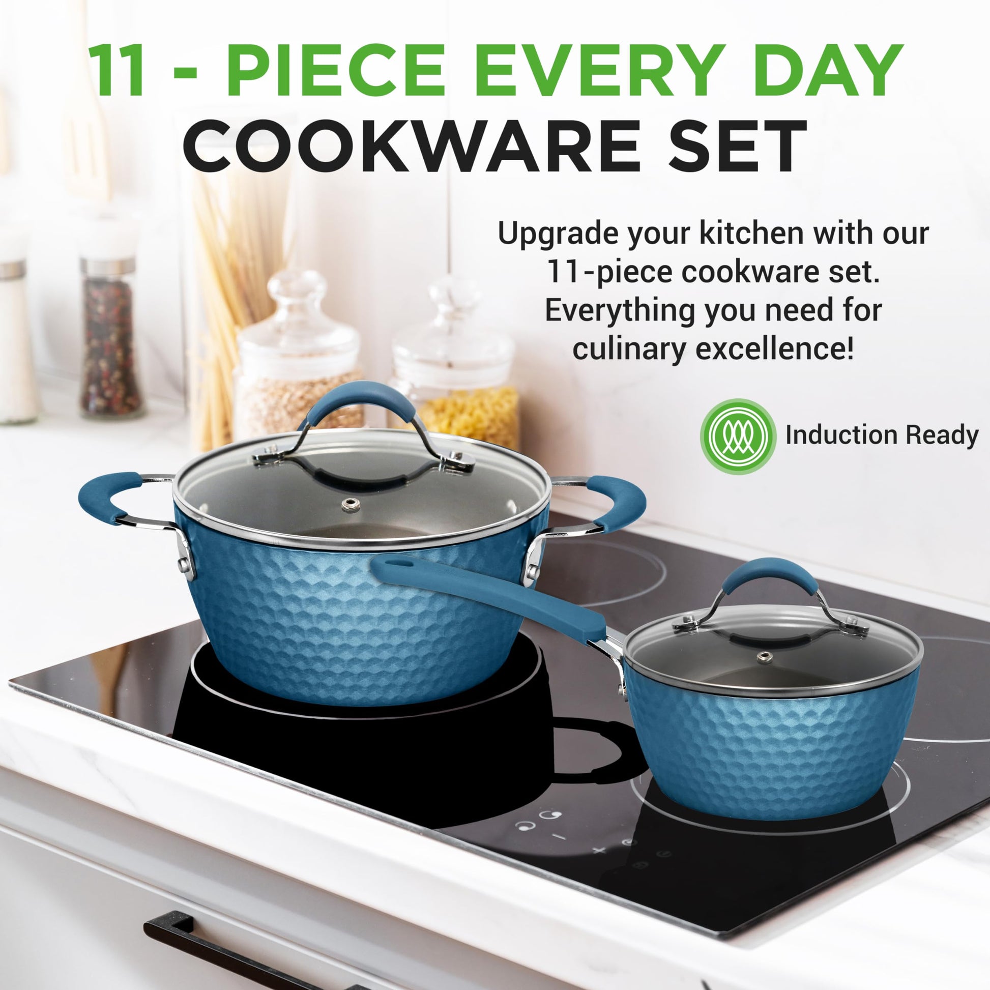 NutriChef 11 Pc Ceramic Cookware Set - Excilon Blue Diamond, Nonstick, Induction Ready, Includes Saucepan, Fry Pans, Dutch Oven, Utensils, Dishwasher Safe - NCCW11BD.7