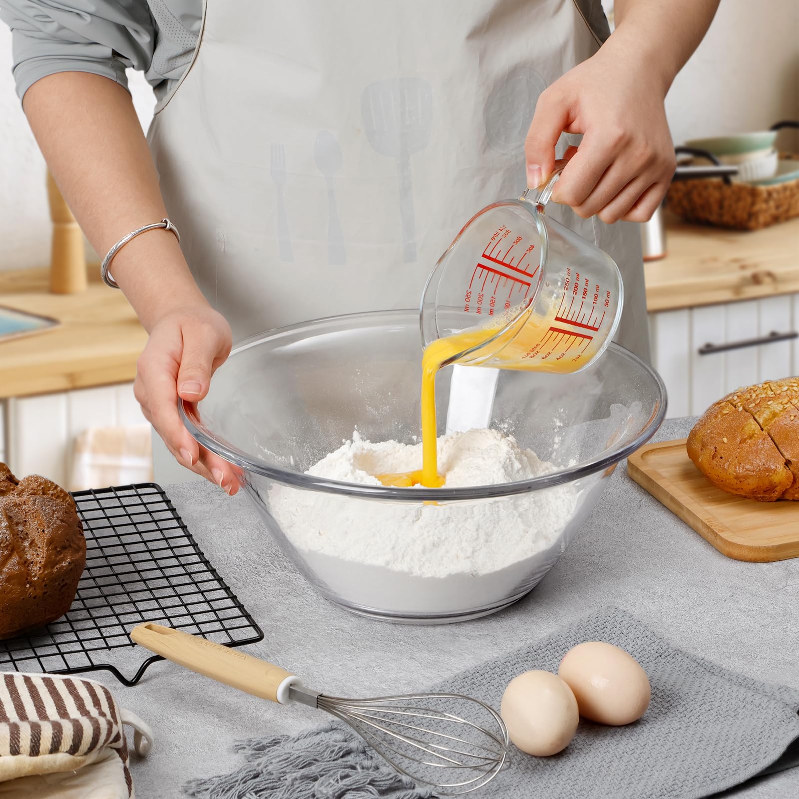 - Clear Visibility for Cooking Prep: Glass bowls are transparent, allowing for clear visibility of the ingredients inside. This makes it easier to gauge quantities, identify colors, and ensure even mixing or chopping, which is particularly helpful when preparing salads, marinades, or any dish requiring precise measurements.