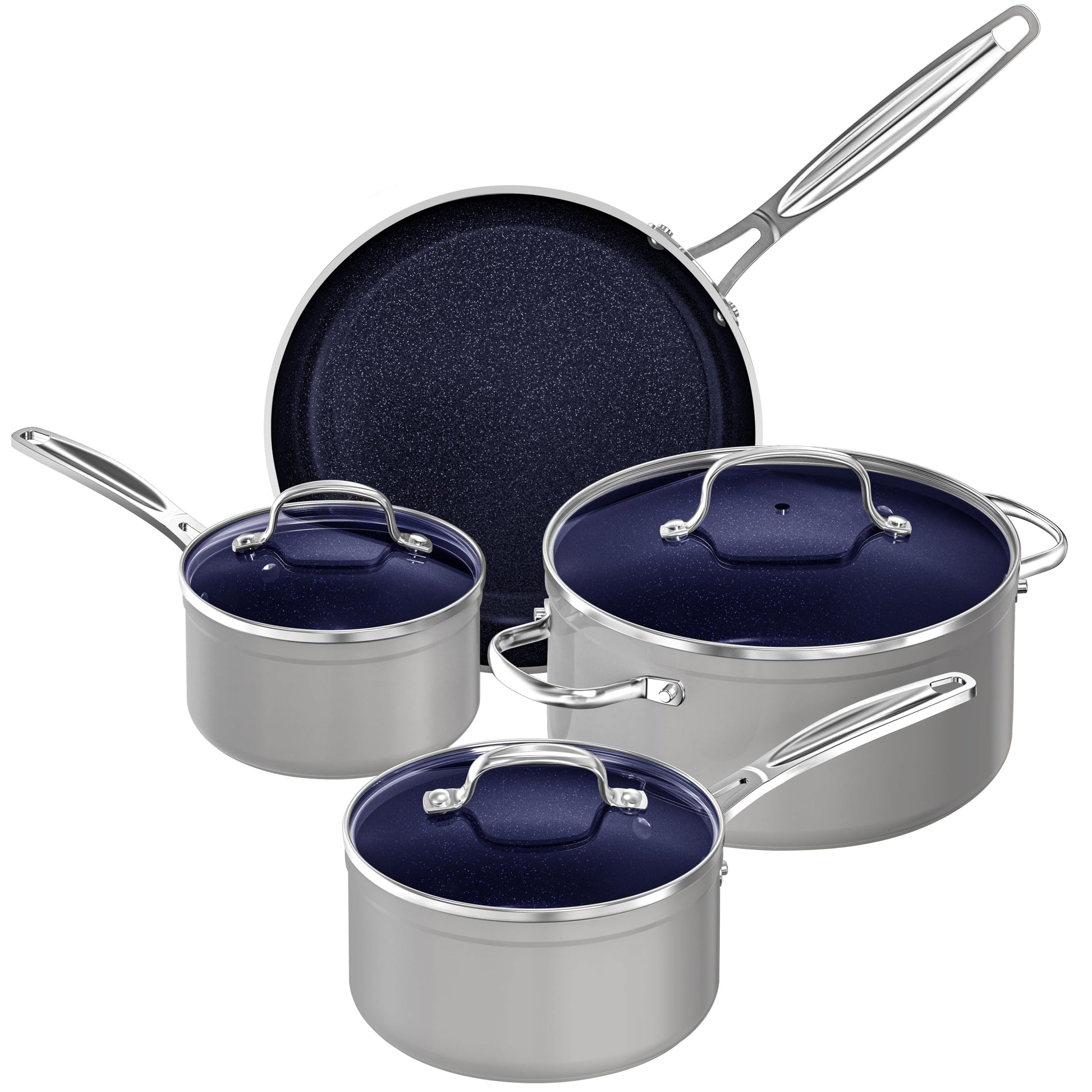- WHAT’S INCLUDED – 1.5 qt. saucepan with lid; 2 qt. saucepan with lid; 5 qt. stock pot with lid; and 9.5” fry pan. Every piece is treated with the revolutionary Duralon Blue Ceramic Coating.
