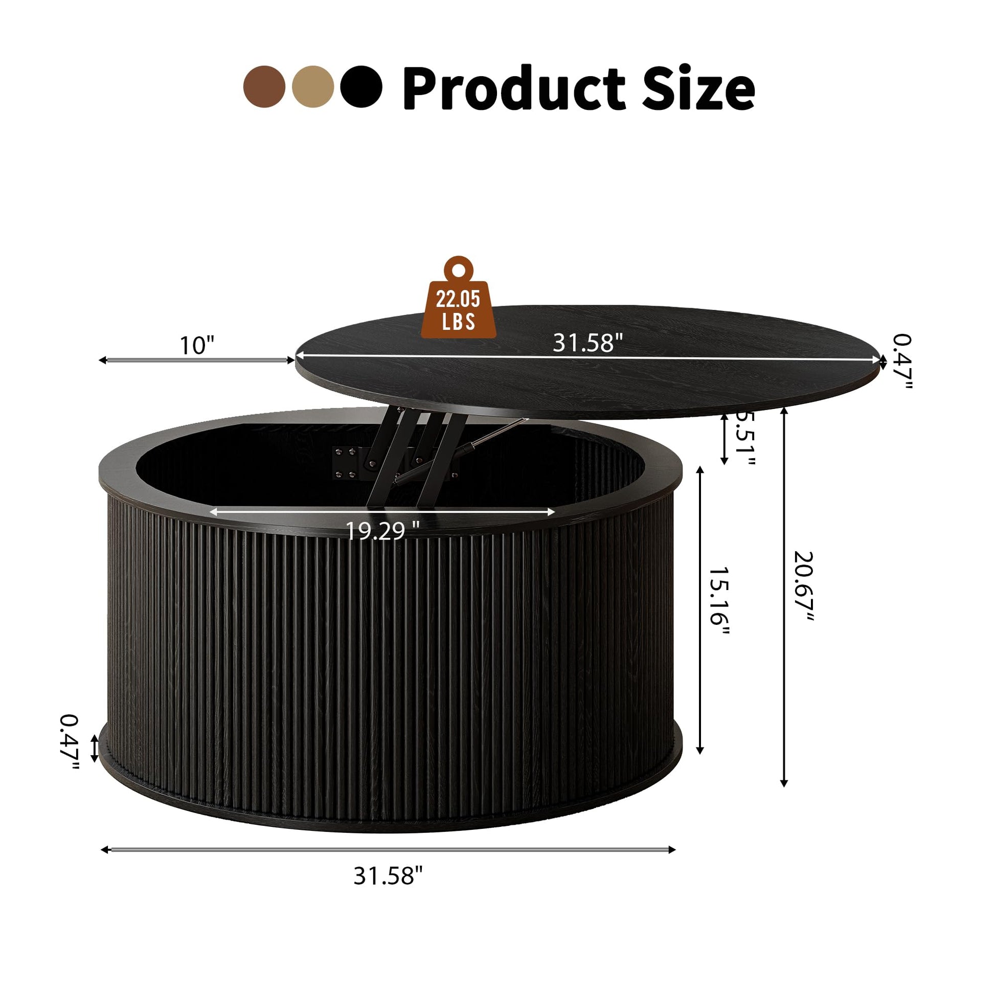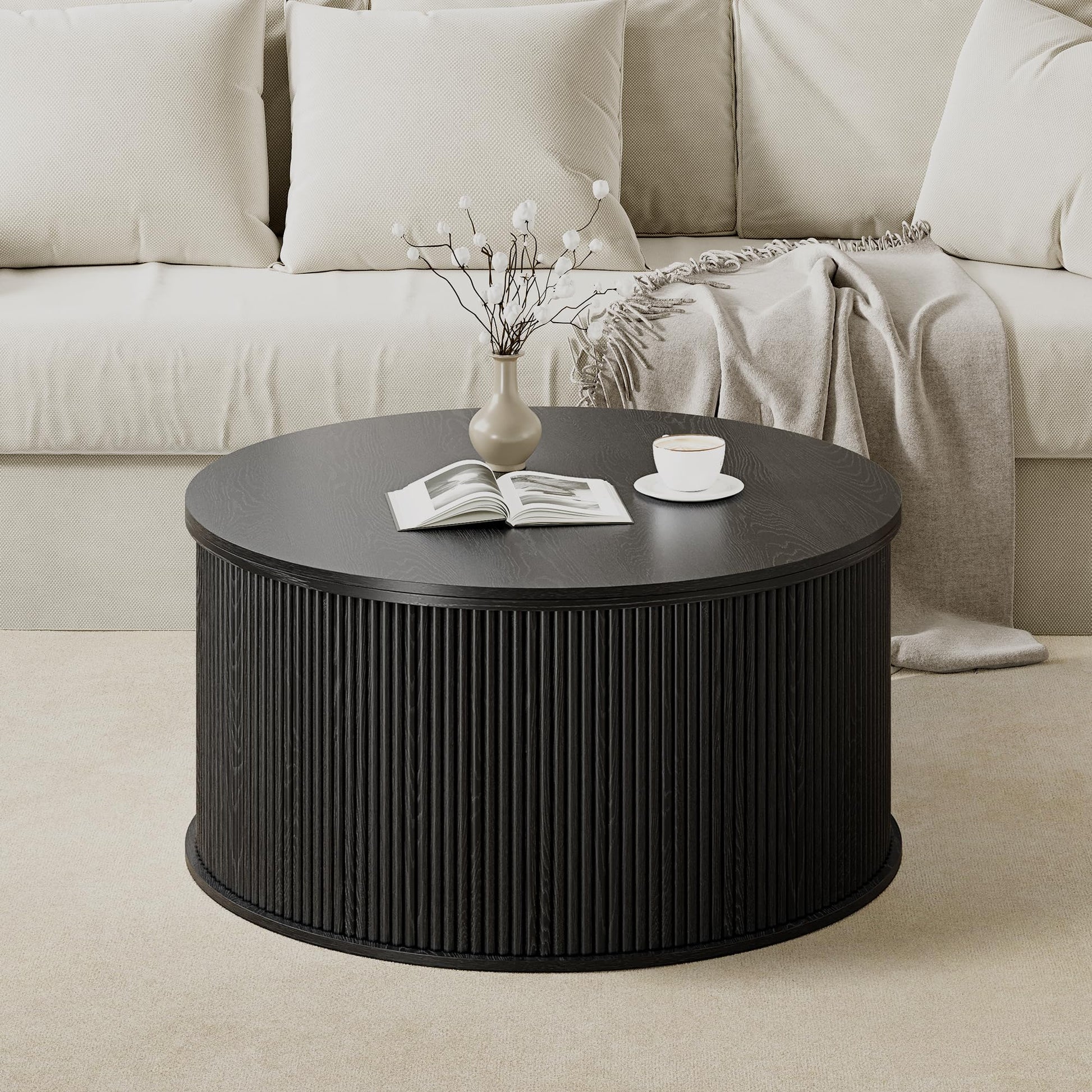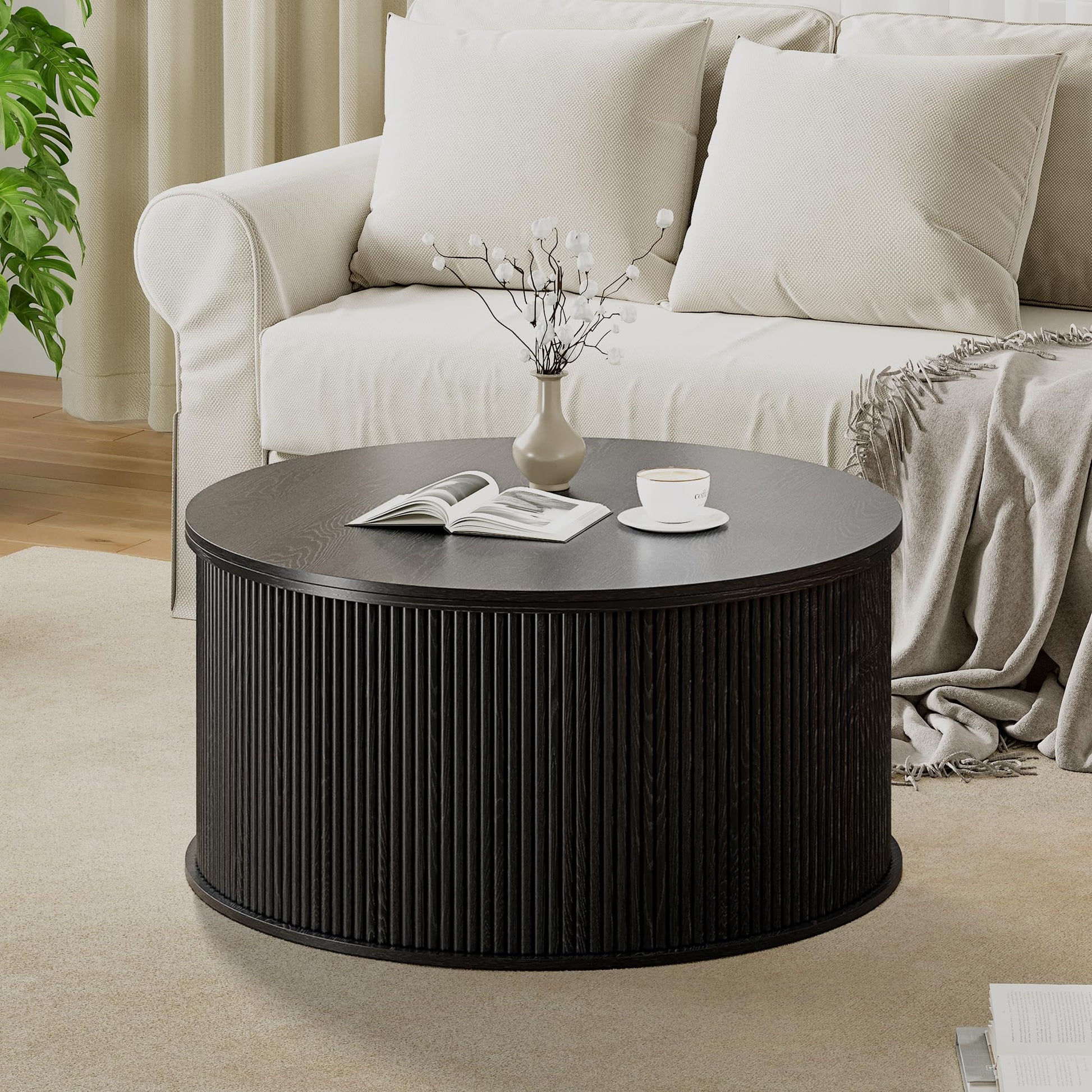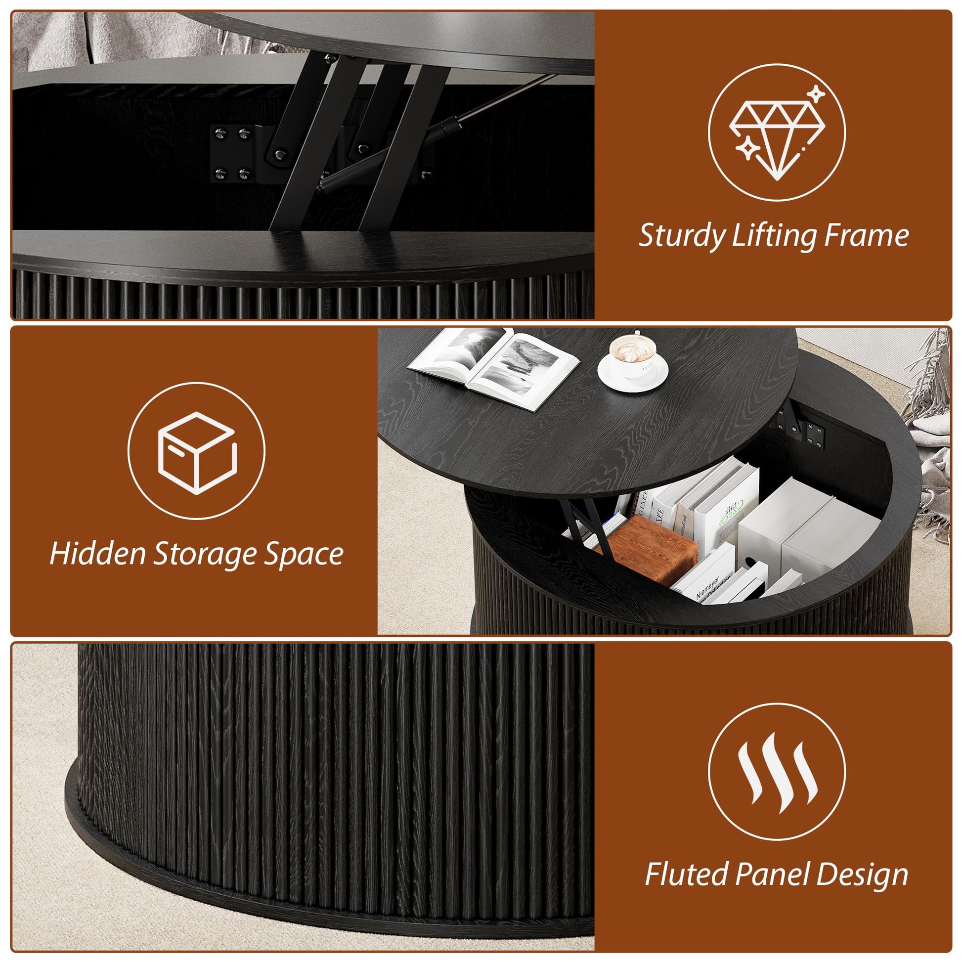 NVETHM Round Coffee Table, Lift Top Coffee Table with Storage, Farmhouse Fluted Center Table Circle Dining Table for Living Room, Reception Room, Home Office (Black)