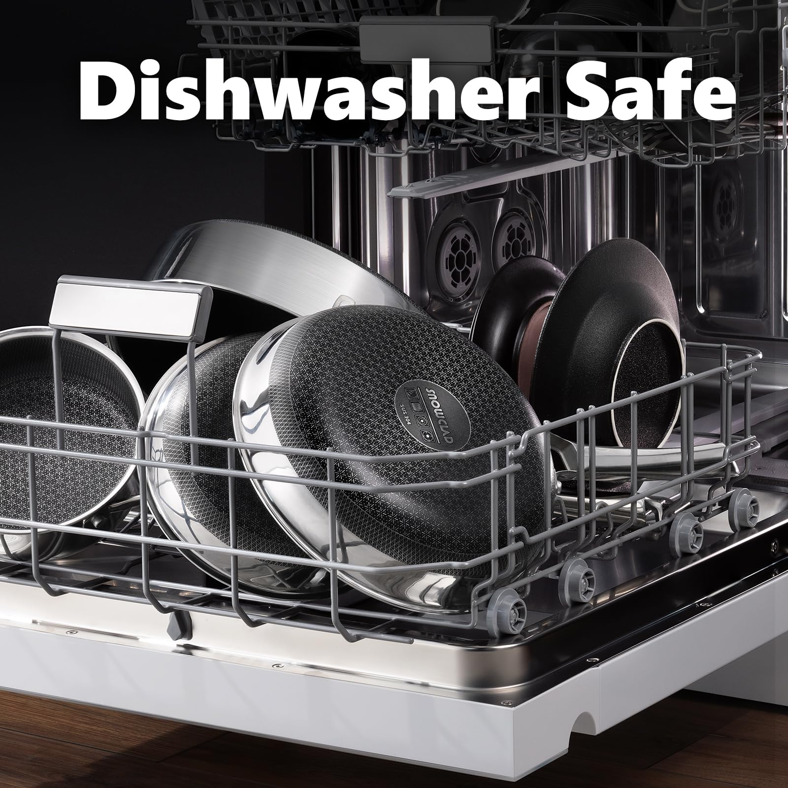 - 〔Premium Durability〕: Crafted with high-grade stainless steel, our pan is designed for enduring use. The non-toxic surface ensures a safe and efficient cooking experience. For added convenience, these pans are also dishwasher safe.