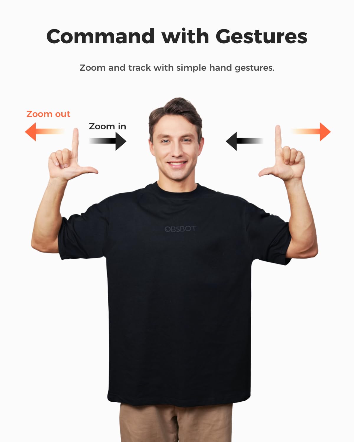 - 【Dynamic Gesture Control】 Along with the 2.0 dynamic gesture control, our streaming camera says goodbye to cumbersome manual operation. Simply face the web cam, make an “🖐” gesture to lock the portrait tracking target, and make an “👆” gesture to control the zoom easily.