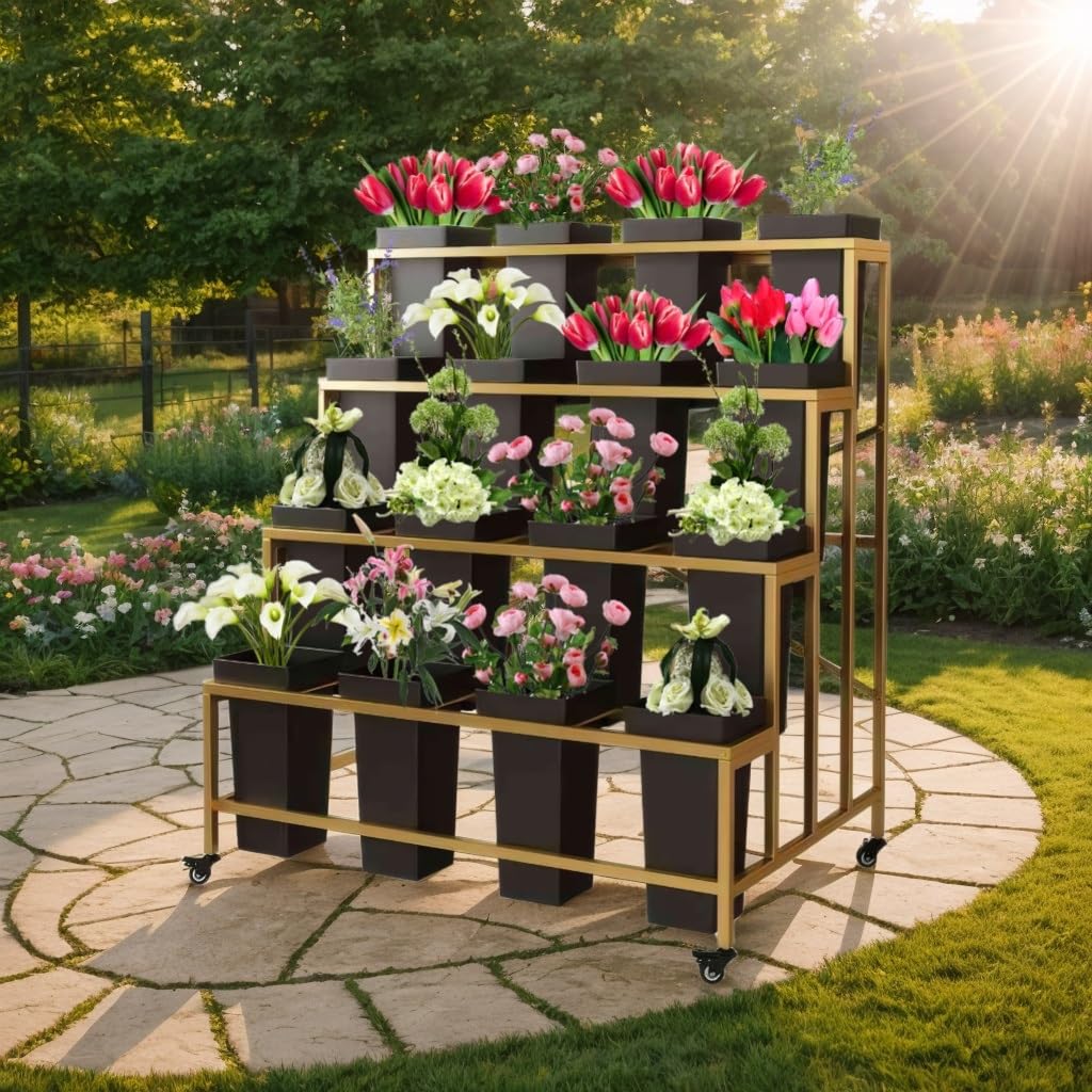 OMKUOSYA 4 Tier Flower Display Stand, Indoor And Outdoor Metal Flower Stand With Wheels, Plant Stand With 16pcs Buckets For Florist Garden Patio(Gold rack and black barrel)