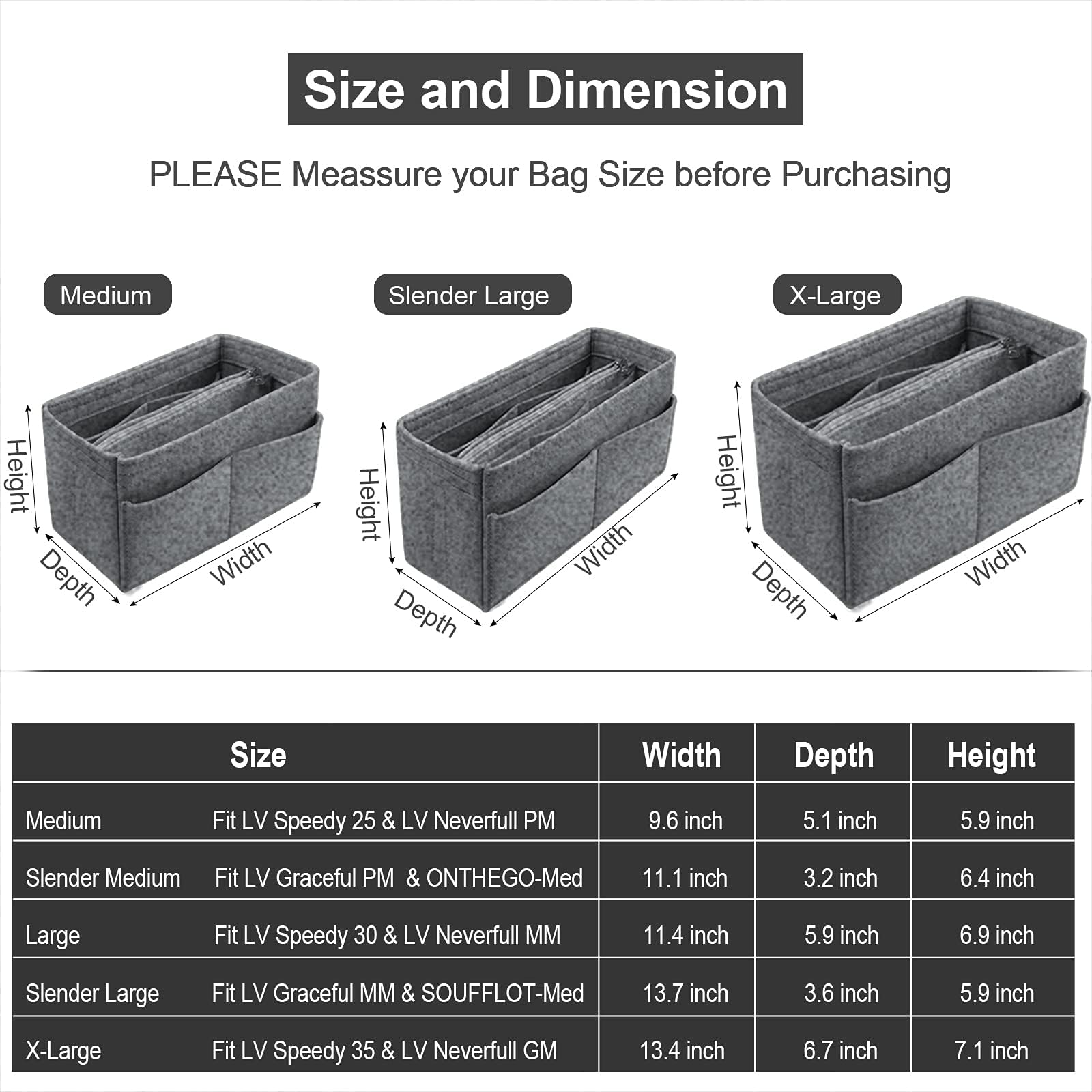 - 5 Size Options: Our bag insert comes in 5 sizes, compatible with Neverfull, Longchamp Le Pliage Tote, Speedy, Goyard, MK, Coach, Katespade, etc. Medium: 9.6' x 5.1' x 5.9' Slender Medium: 11.1' x 3.2' x 6.4' Large: 11.4' x 5.9' x 6.9' Slender Large: 13.7' x 3.6' x 5.9' X-Large: 13.4' x 6.7' x 7.1' NOTE: Ideal fit means within 1.5', loose fit means within 2.5'