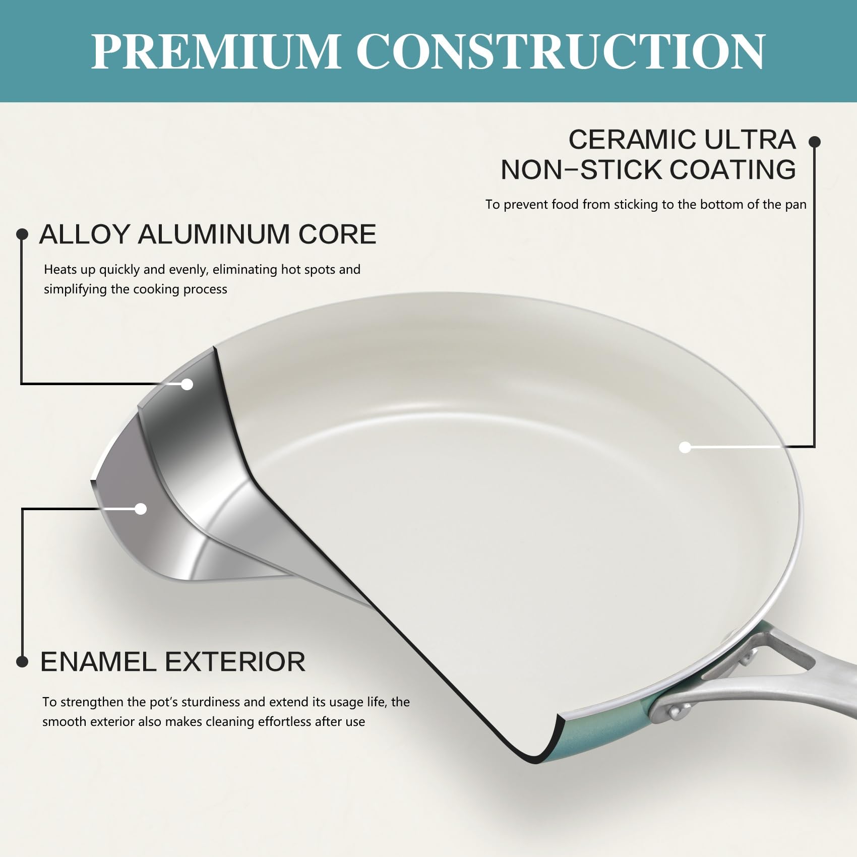 ONGIFT Kitchen Pots and Pans Set Non Stick, 11 Pieces Cookware Set Ceramic Nonstick Coated, Scratch-Resistant, PFAS, PFOA Free, Oven Safe, Rapidly & Evenly Heats, Enamel Exterior Cooking Set - Teal