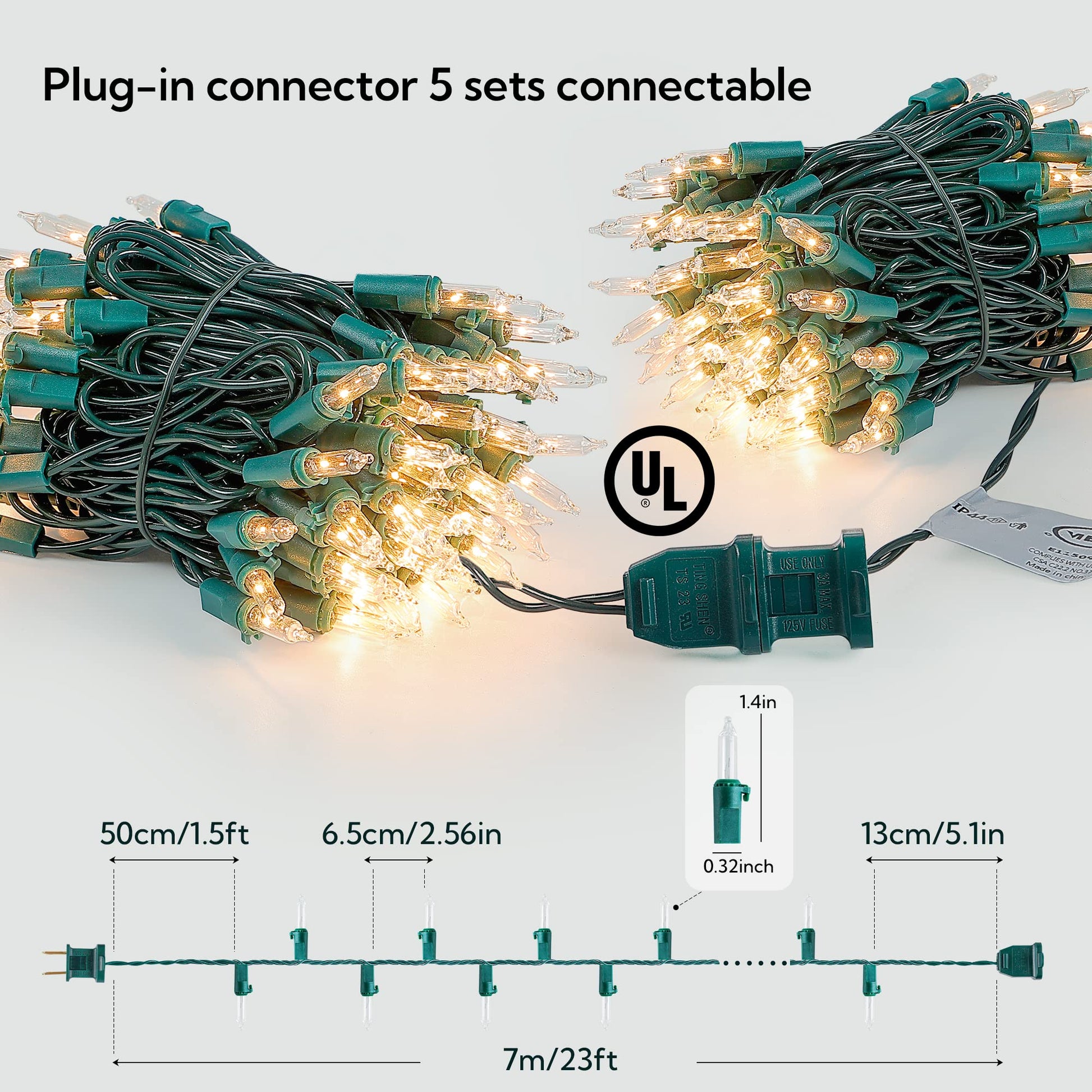 - 🎄Steady Lighting with Friendly Usage:Clear string light is independently illuminated and does not affect each other .They are easy to fix and replace with spare extra bulbs and fuse that no additional tools needed.Each bulb has external lamp lock that prevents from loose when dress up your beautiful home.Thicker green wire with strong insulated copper core, tangle-free to use,High quality UL certified products ensure the safety of you and your family.