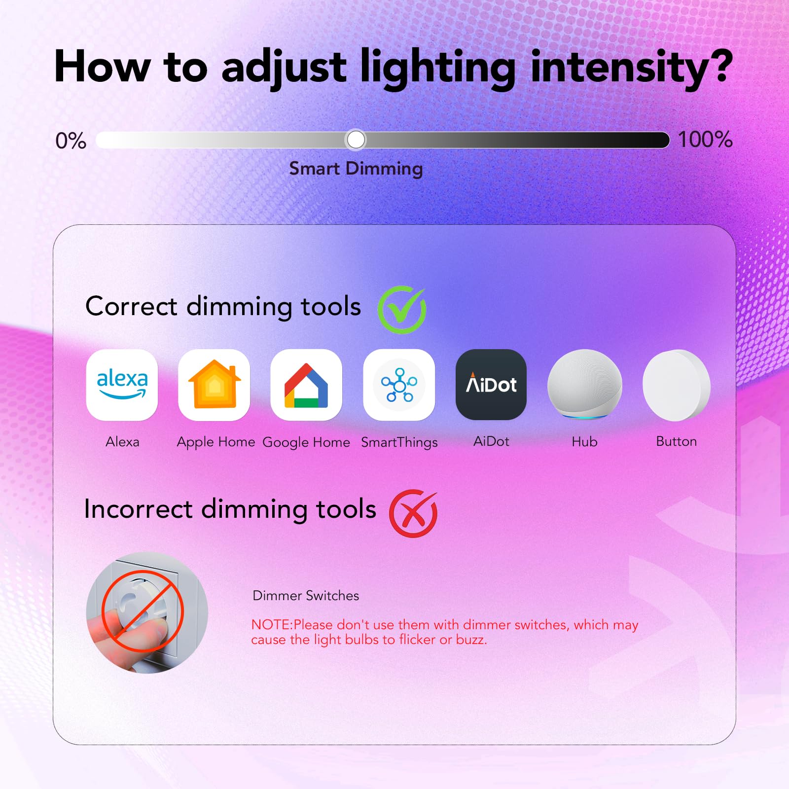 - 【Note】Please ensure the bulb fits your lamp before buying to avoid trouble. It supports only 2.4Ghz WiFi, not 5.0Ghz. Smart bulbs usually don't work with dimmer switches, which may cause flickering, burning out, or buzzing. To dim the lights, use Hub/Apps