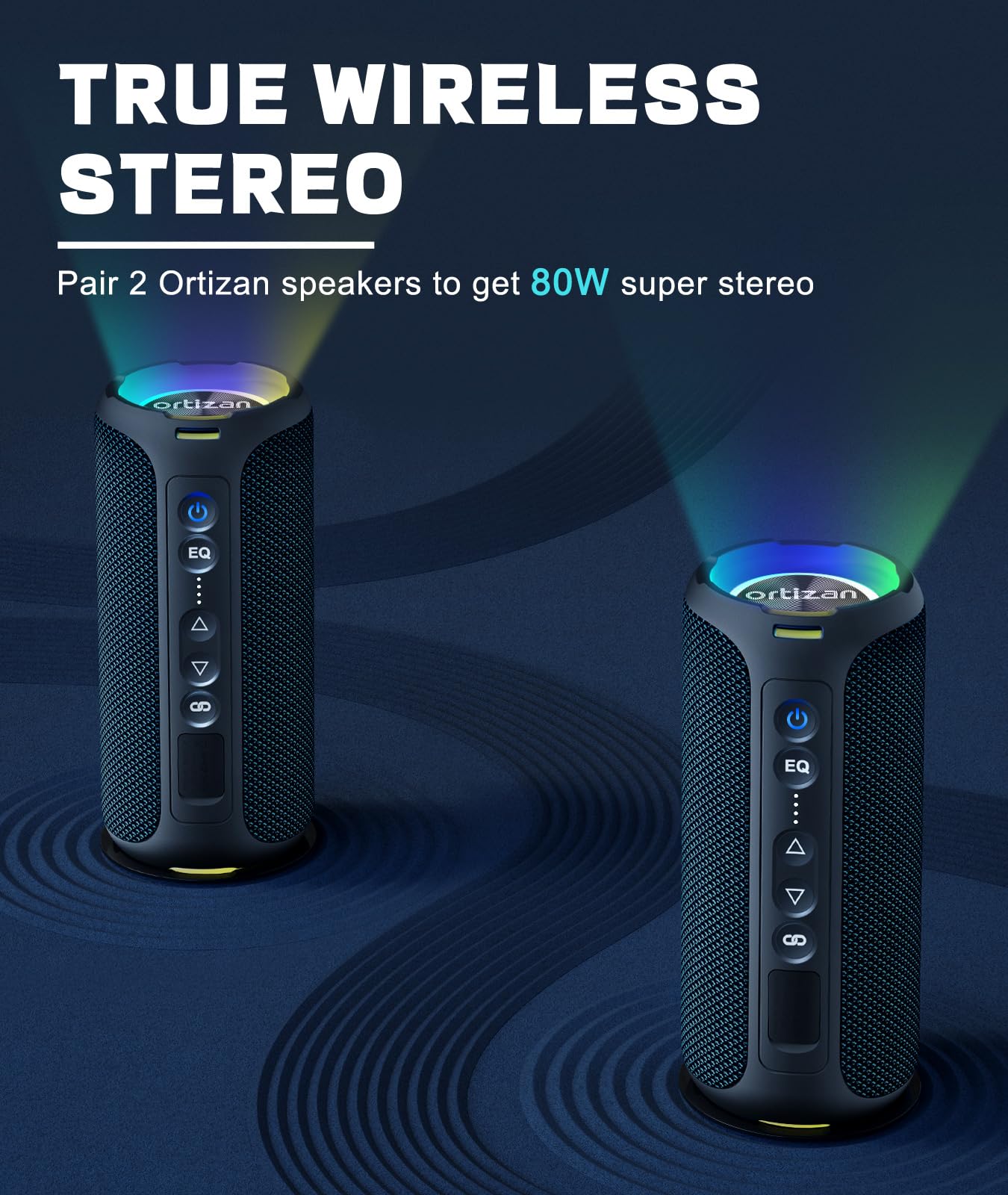 - 【True Wireless Stereo Pairing】Connect two Ortizan X8 Pro wireless speakers through a single device to get immersive stereo sound and loud volume of up to 80W, enjoy the shocking beats that this bass Bluetooth speaker fills every corner of the room, ready for any time Bring bolder sound to bigger gatherings.