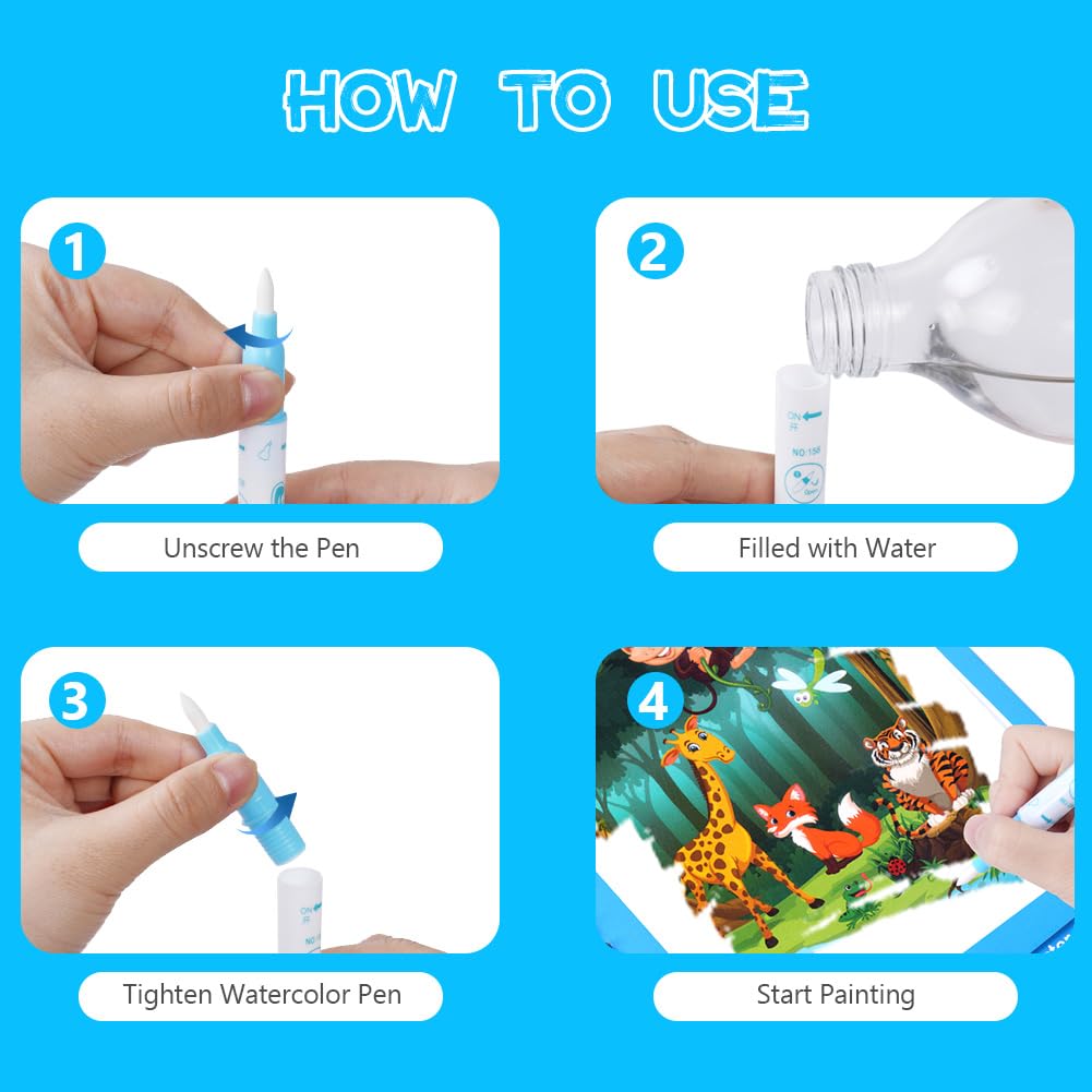 - Easy to Use: You just use the magic pen with water, add some water, and smear on every corner of the water book to see the hidden colors, patterns, and text; they will disappear naturally after drying for 8 minutes, so you can use it again and again Write and paint again with these watercolor paints!