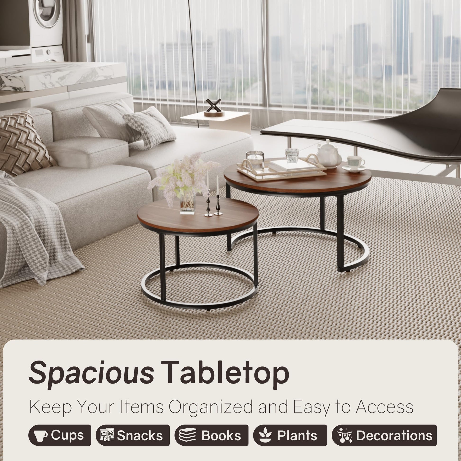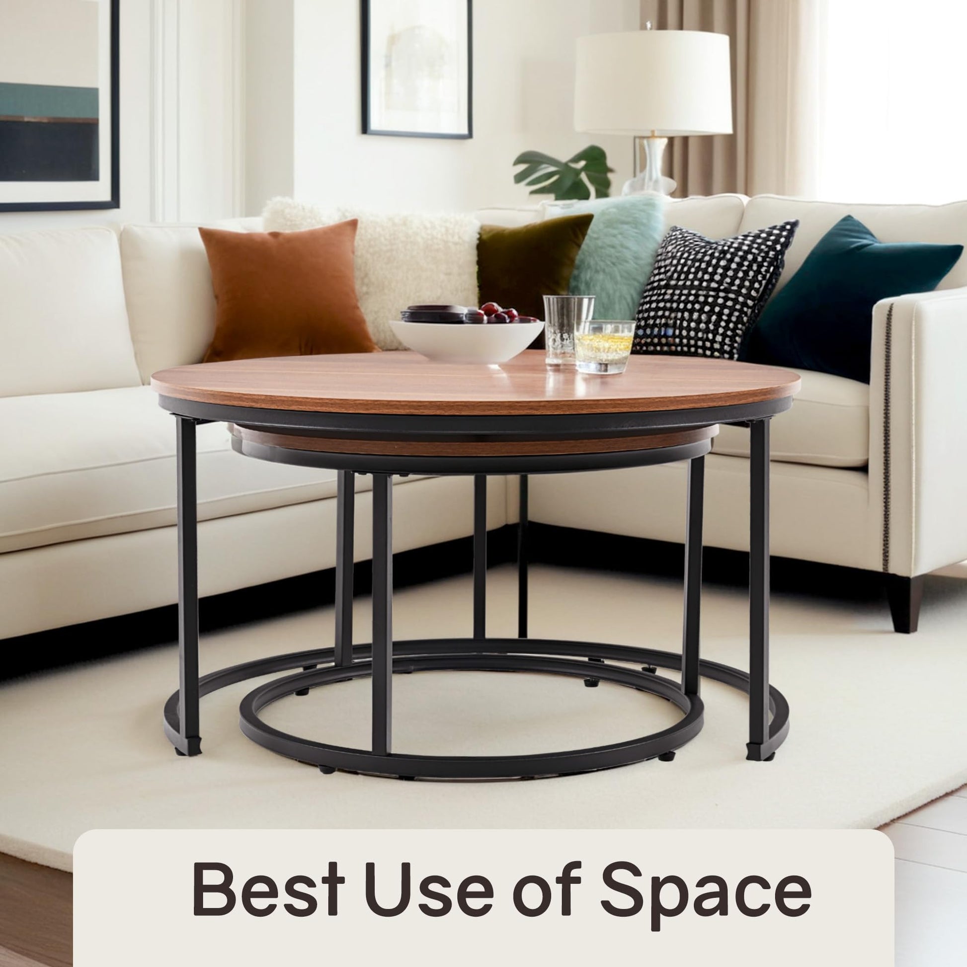 Otterease Nesting Tables Set of 2, 31.5" Round Coffee Table, Small Nesting Coffee Table with Adjustable Non-Slip Fee, Wood Grain Top Nesting Tables for Living Room, Bedroom (Wood Grain Brown)