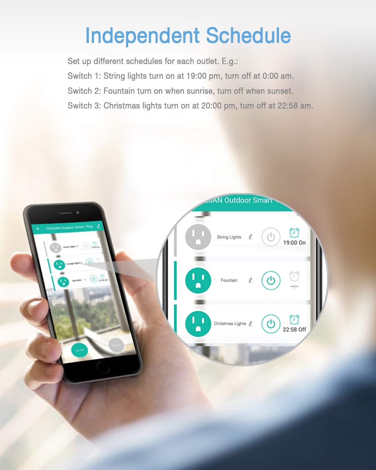 - 3 Individual Smart Outlets: TESSAN smart wifi power strip comes with 3 outlets; Three AC outlets can be controlled individually or simultaneously; With IP44 waterproof design, built-in weatherproof covers for each outlet; Protect the outlets from rain and dust when not in use; The smart plug can be placed indoor and outdoor; Ideal for your garden, patio, string lights and decorations, landscape lights, fountains, heavy duty electrical outlets, pool pumps (Max 2HP), lawn mowers and more