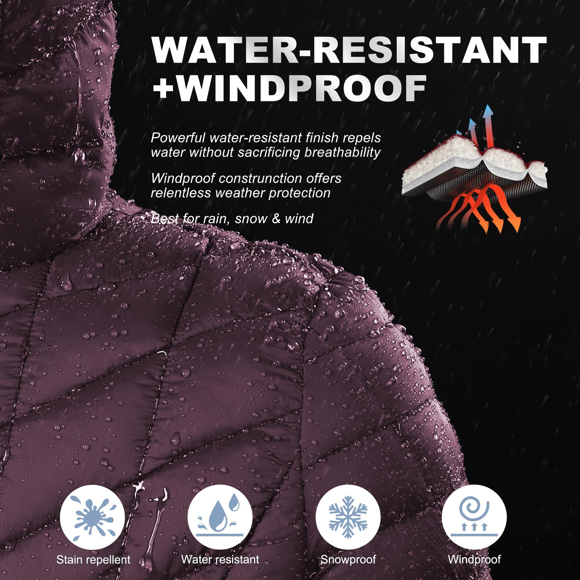 - ULTRA LIGHTWEIGHT/BREATHABLE/WATER RESISTANT/WINDPROOF/PACKABLE: This puffer coat with hood for women offers protective insulation from the elements for outdoor enthusiasts and delivers exceptional warmth and breathability.It's very light and packable for traveling, hiking,camping and other outdoor activities, suitable for cold rainy, snowy and windy weather.