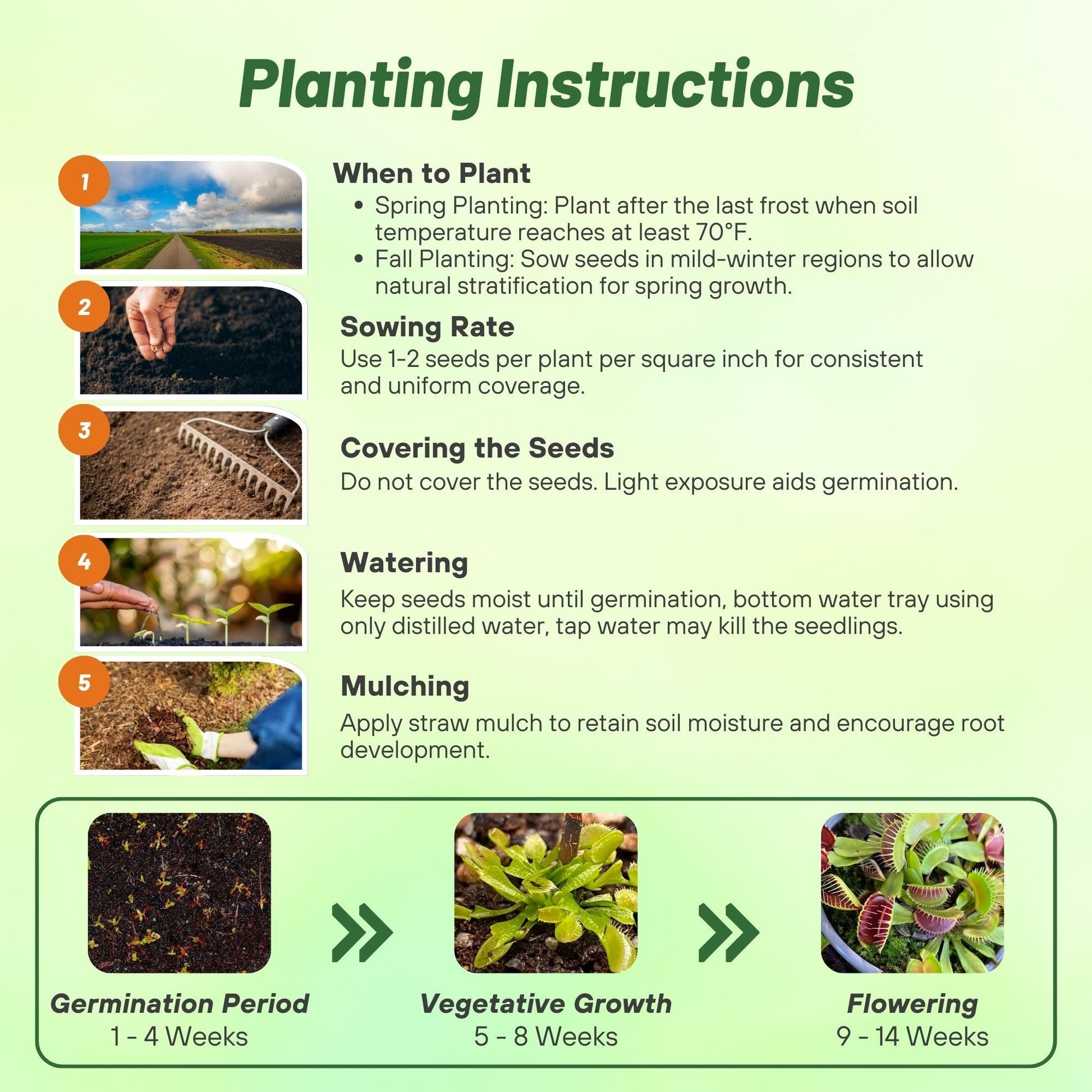 - SOIL, PLANTING & WATERING: Venus Fly trap seeds requires poor soil, such as sphagnum or peat moss, with good drainage. Plant seeds by sowing 1-2 pieces and spacing them 3-4 inches apart. Keep the soil moist with distilled water and bottom water to minimize mineral build-up. Ensure the Venus Fly trap pot has proper drainage to promote healthy root growth and minimize waterlogging.