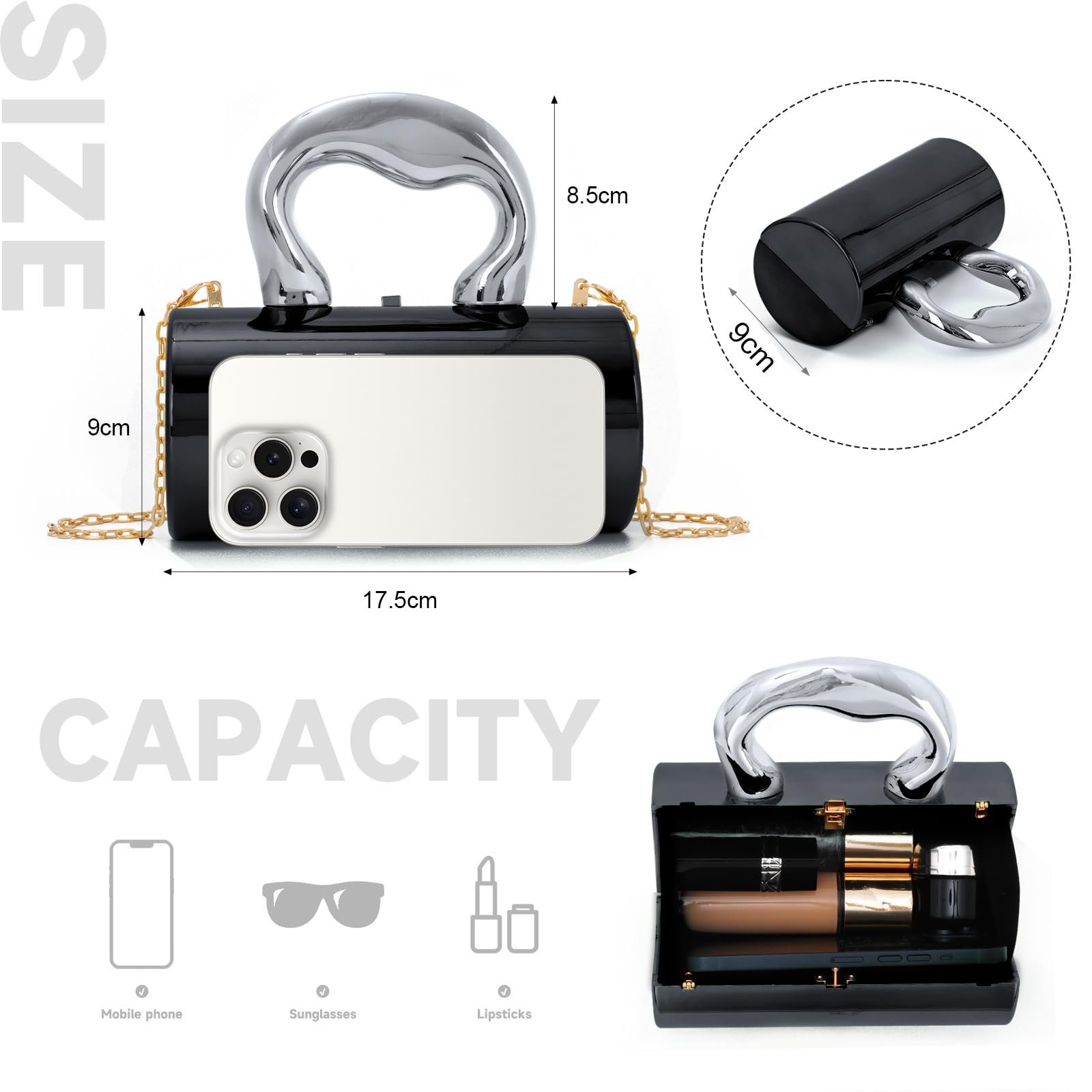 - Capacity for formal party ---17.5*9*9cm/6.9*3.5*23.5inch.This acrylic handbags is enough for evening party. Cellphone, keys,lipstick, cards,lipstick and small items can be held.