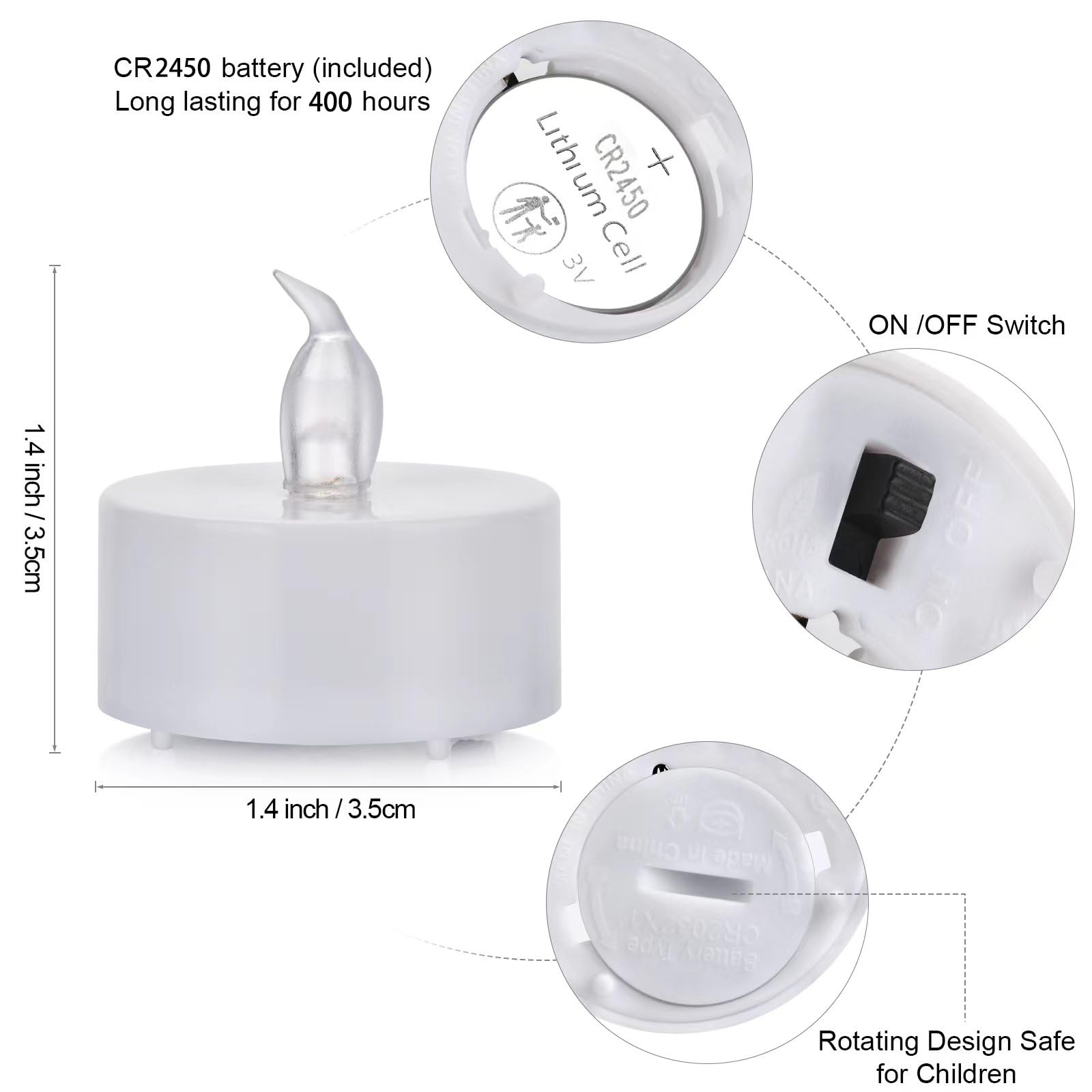 - High Capacity Battery: The remote control tea light contains a battery (CR2450 button cell) at the bottom of the tea light, high capacity battery. When the battery runs out, you can replace the battery from the bottom, cycle use