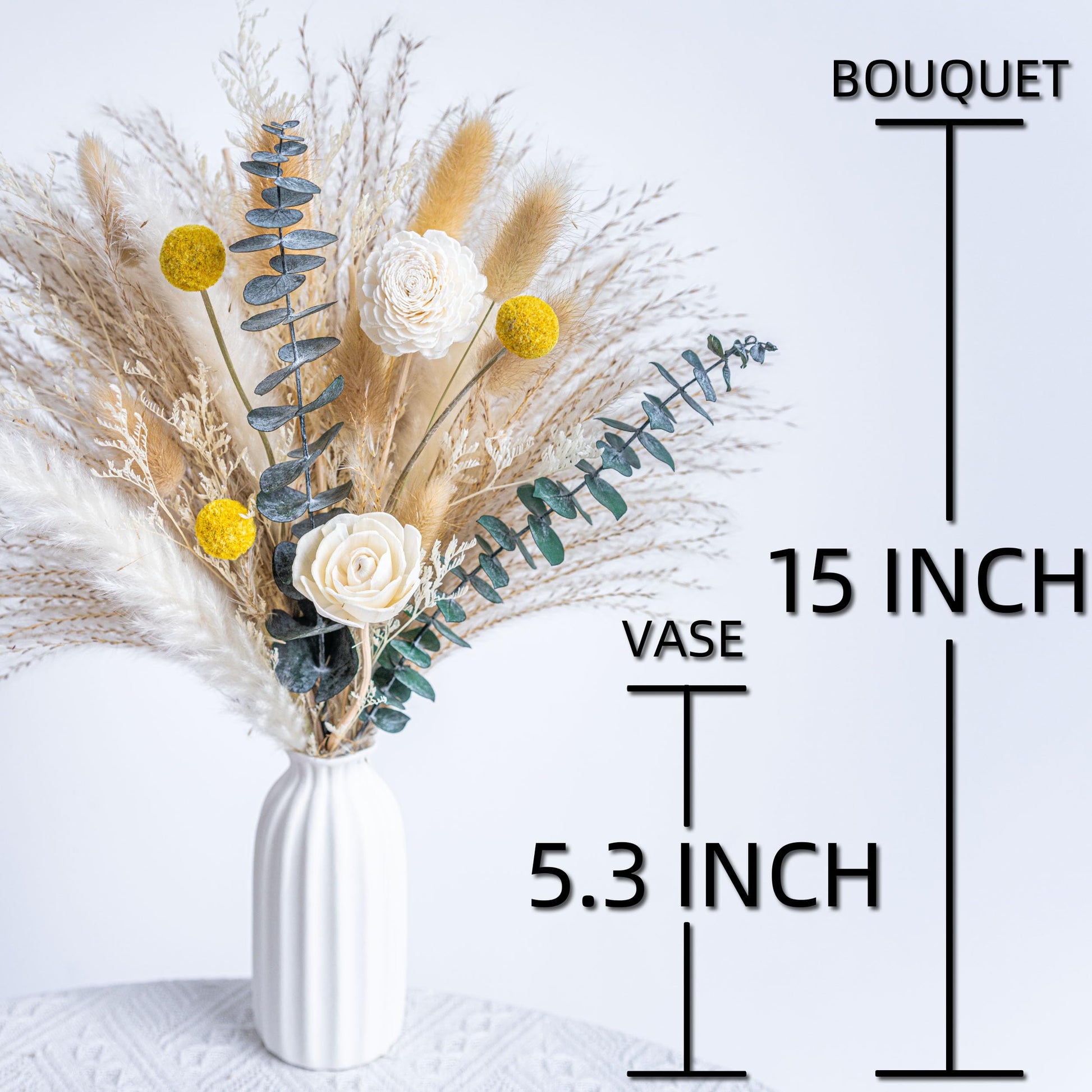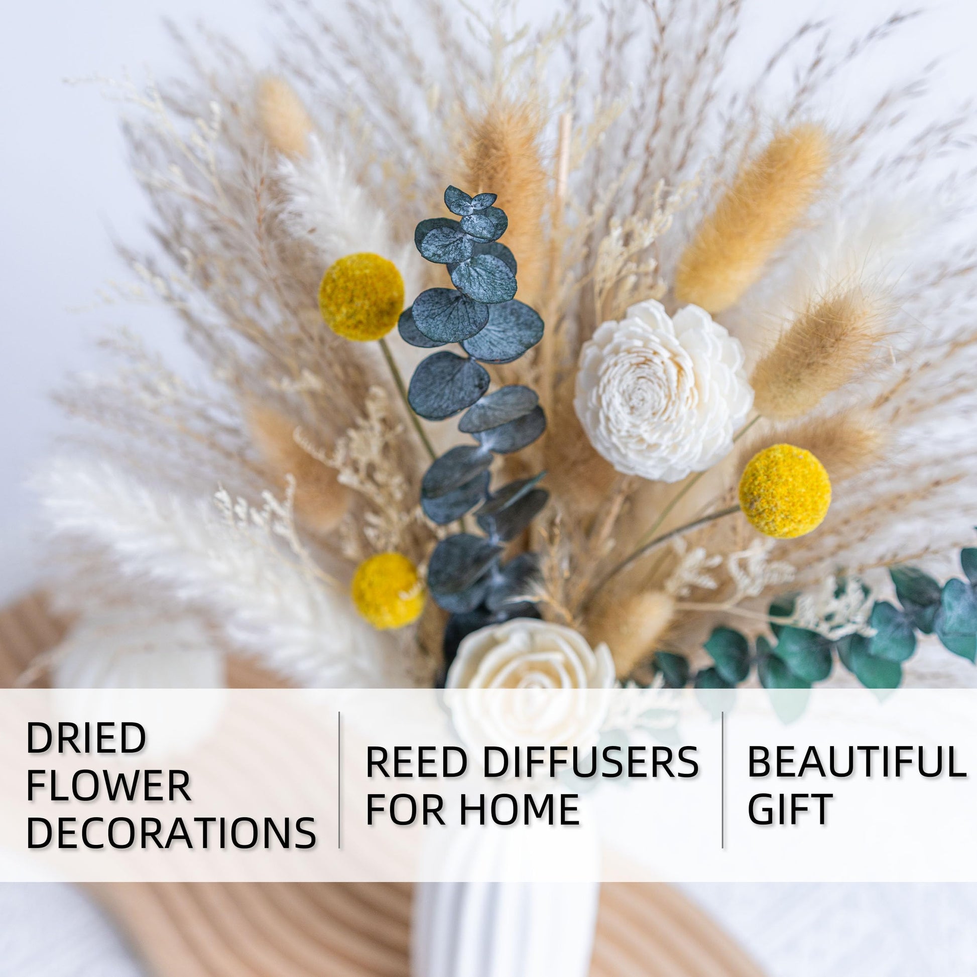 - Unique design dried flowers, meticulously handcrafted including White ceramic vase, Diffusers Flowers,Natural Pampas Grass stalks, Bunny tails and more. using dried flowers materials giving a minimalist feel and creating a relaxed feel in the room.