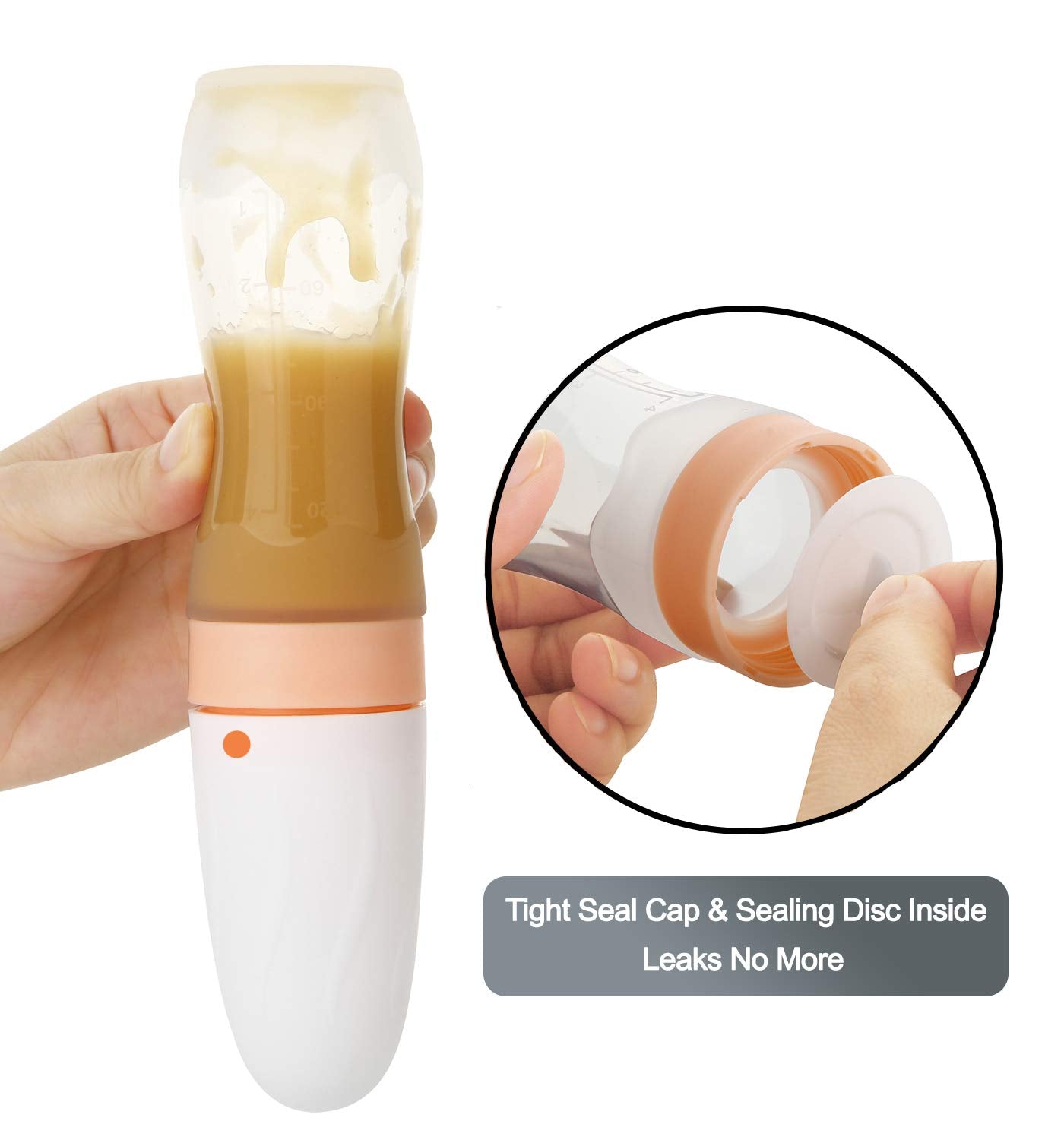 - 【PROTECTIVE CAP & STAND-UP BOTTLE 】 Our baby food feeders come with a protective cap. Not only does this cap keep the silicone tip clean and hygienic, but also stops you covering your hands with baby food while you fill the food reservoir. These bottles can stand upright by themselves, freeing your hands for the unexpected.