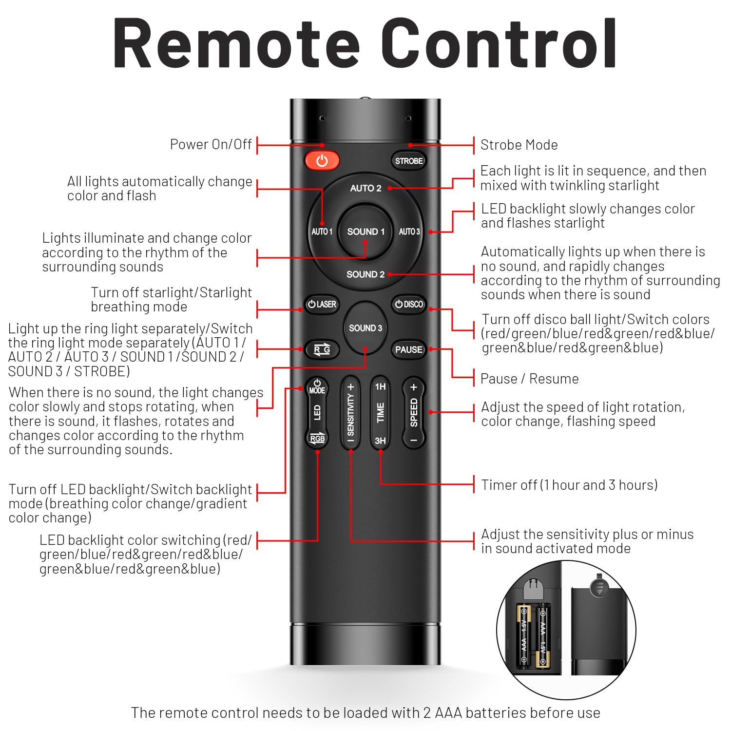 - Easy Operation: Simple plug-and-play setup with a remote control for easy adjustment of light modes, sound activated sensitivity, light color, speed, and a timer that you can set to turn off after 1 hour and 3 hours.