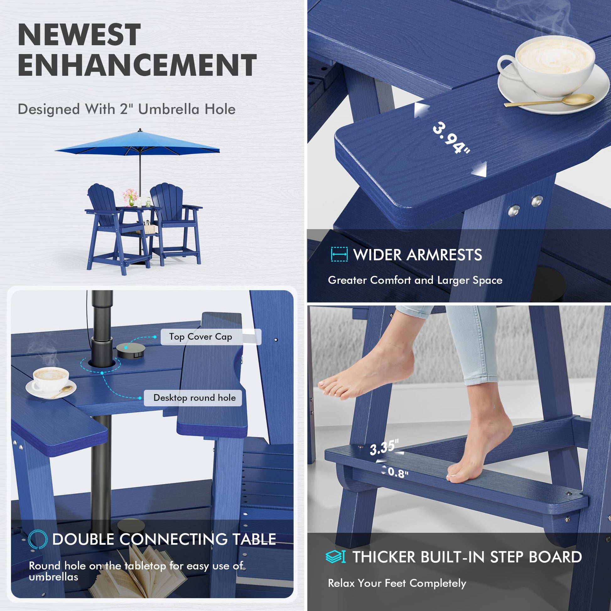- Double-Layer Tray with Umbrella Hole: PatioPerk Tall Adirondack Chairs features a double-layer tray with a 2-inch umbrella hole. The upper tray holds drinks or small items, while the lower tray offers extra storage. Perfect for shaded outdoor relaxation