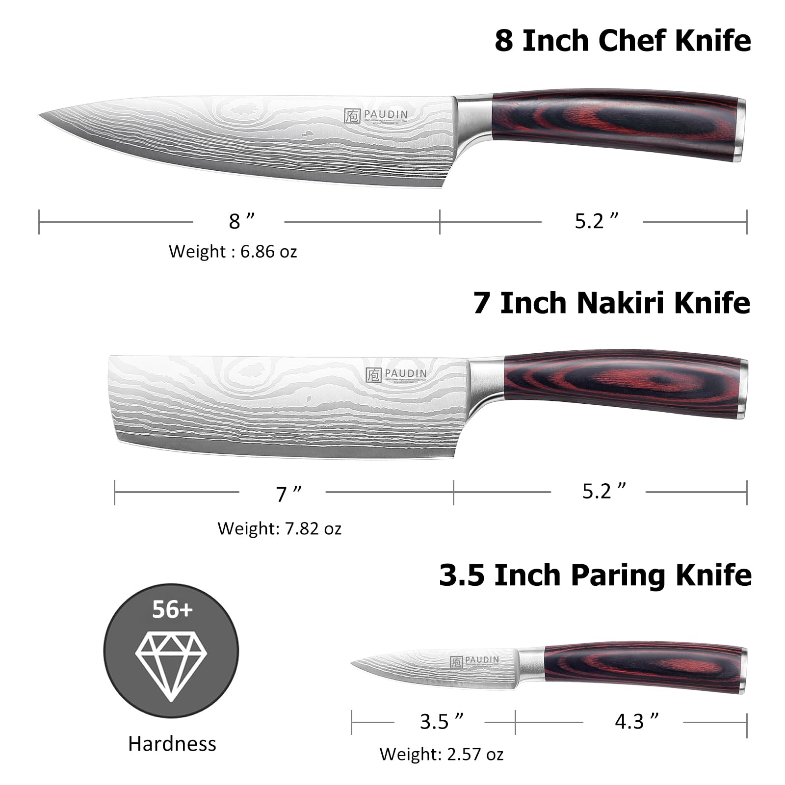 - Professional Boxed Knife Set: Paudin team chooses the most popular and great knife set for you! The 3 Pieces of knives include an 8’’ chef’s knife, a 7’’ nakiri knife, and a 3.5’’ paring knife. These kitchen knives can easily handle your daily kitchen tasks of chopping, mincing, and dicing. This knife set is also suitable for home and professional use.